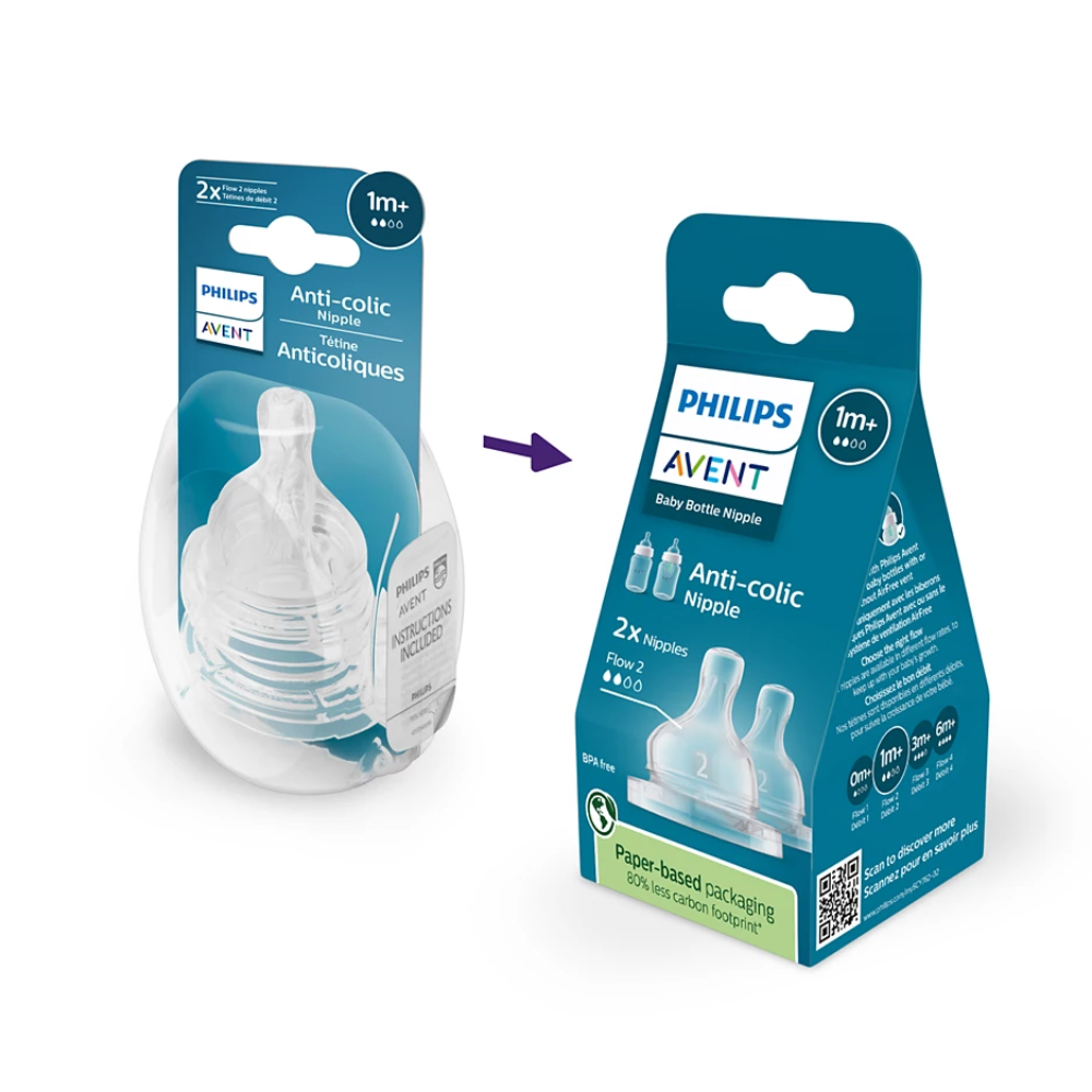 Tetinele anti-colici Philips Avent sunt disponibile cu debite diferite, pentru a ţine pasul cu creşterea bebeluşului. Recomandăm înlocuirea tetinelor la fiecare 3 luni din motive de igienă.