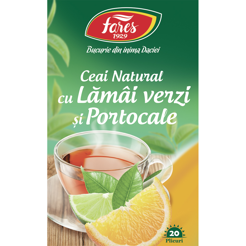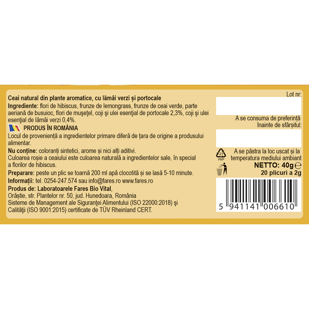 Ceai natural aromat, cu amestec de hibiscus, lamai verzi si portocale, ce ofera un gust intens, fructat si revigorant. Realizat din plante si fructe atent selectionate, fara coloranti sau arome artificiale.