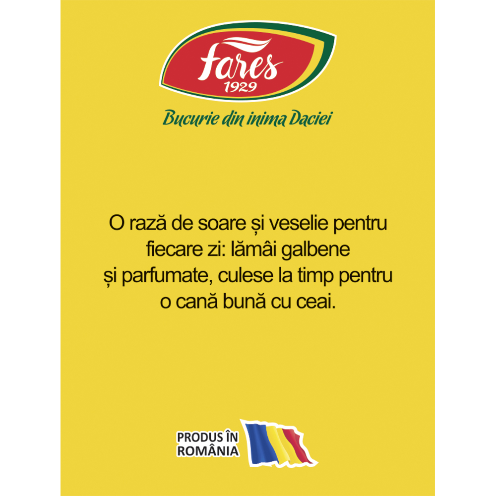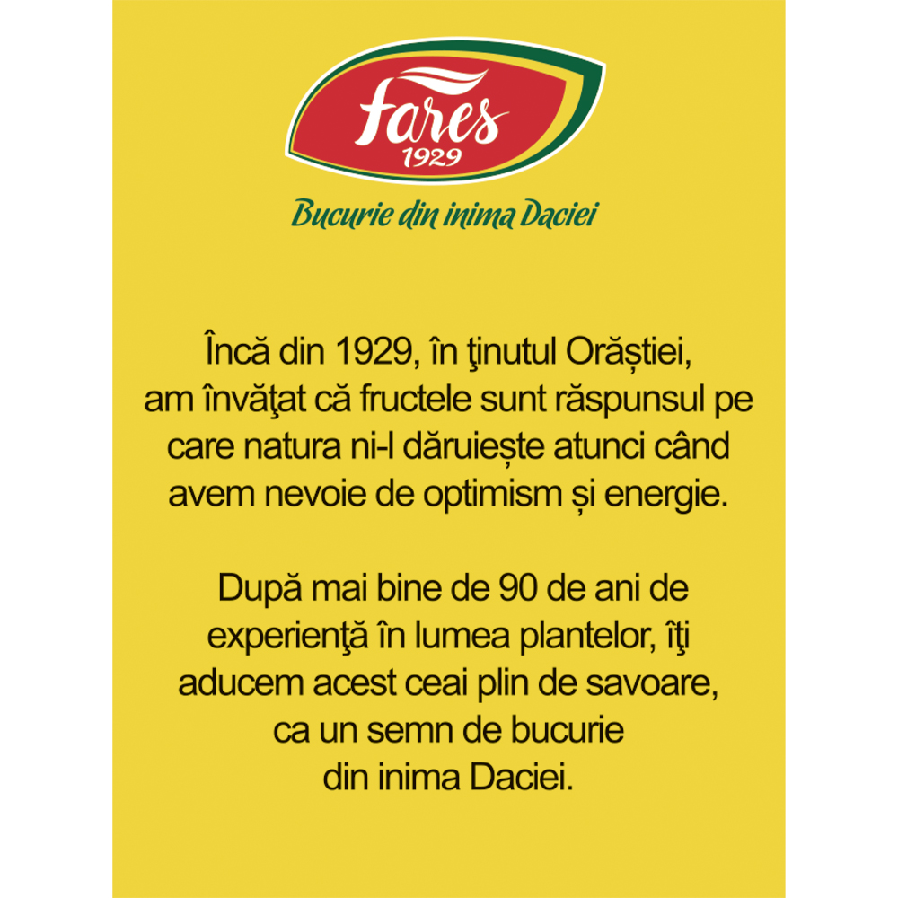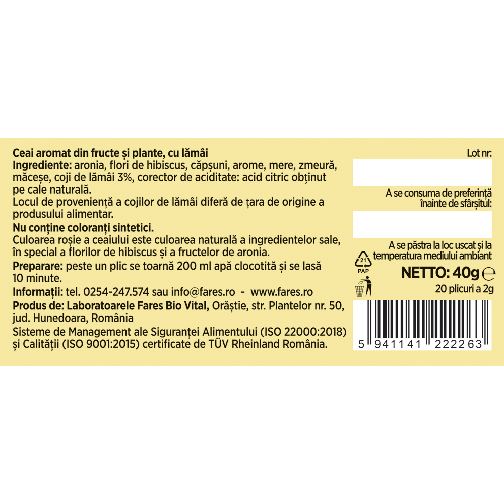 Ceaiul cu lămâie Fares îmbină gustul fructat al aroniei și hibiscusului cu aroma revigorantă a cojilor de lămâie, oferind o băutură plăcută și parfumată, ideală pentru momente de relaxare.