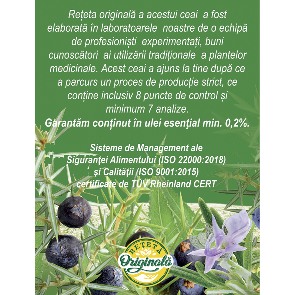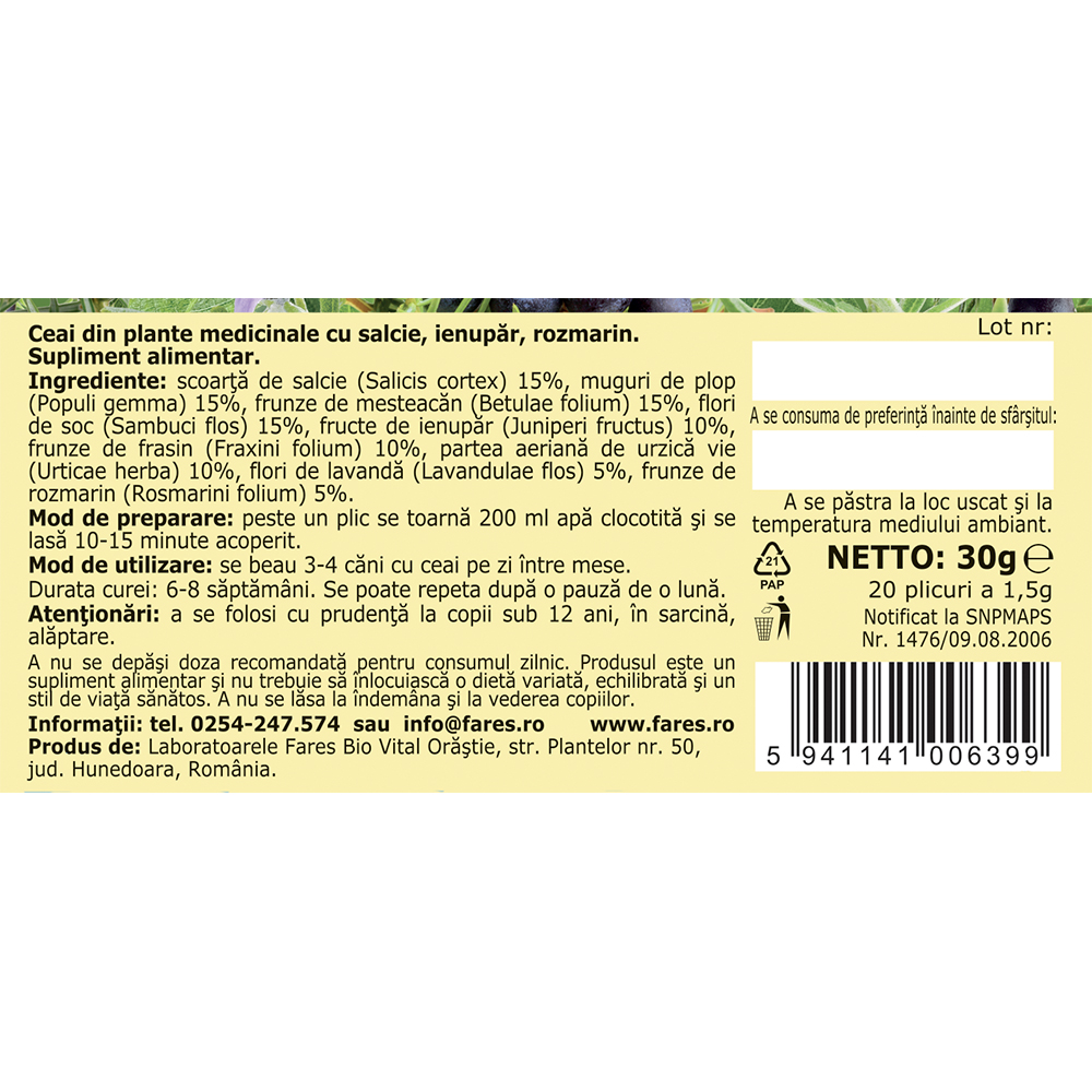 coajă de salcie (Salicis cortex) 15%, muguri de plop (Populi gemma) 15%, frunze de mesteacăn (Betulae folium) 15%, flori de soc (Sambuci flos) 15%, fructe de ienupăr (Juniperi fructus) 10%, frunze de frasin (Fraxini folium) 10%, partea aeriană de urzică vie (Urticae herba) 10%, flori de lavandă (Lavandulae flos) 5%, frunze de rozmarin (Rosmarini folium) 5%
