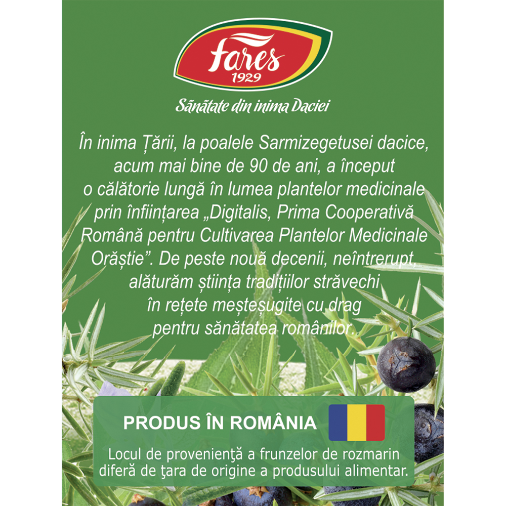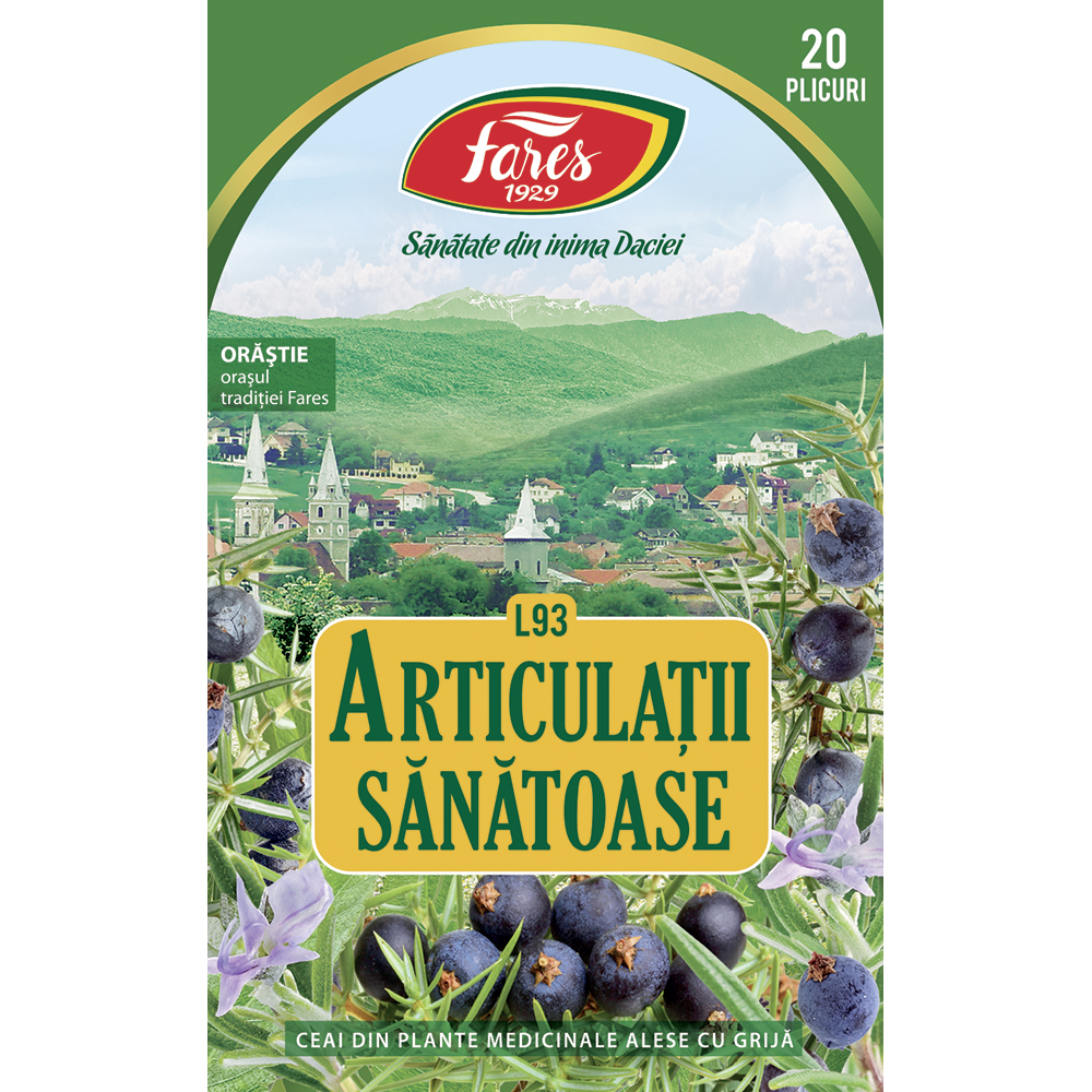Ceaiul Articulații Sănătoase L93 de la Fares este un supliment alimentar pe bază de plante medicinale atent alese, precum salcie, ienupăr și rozmarin. Rețeta tradițională este formulată pentru a completa un stil de viață echilibrat și pentru contribui la menținerea stării generale de bine.