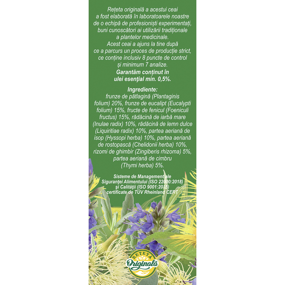 frunze de pătlagină (Plantaginis folium) 20%, frunze de eucalipt (Eucalypti folium) 15%, fructe de fenicul (Foeniculi fructus) 15%, rădăcină de iarbă mare (Inulae radix) 10%, rădăcină de lemn dulce (Liquiritiae radix) 10%, partea aeriană de isop (Hyssopi herba) 10%, partea aeriană de rostopască (Chelidonii herba) 10%, rizomi de ghimbir (Zingiberis rhizoma) 5%, partea aeriană de cimbru (Thymi herba) 5%