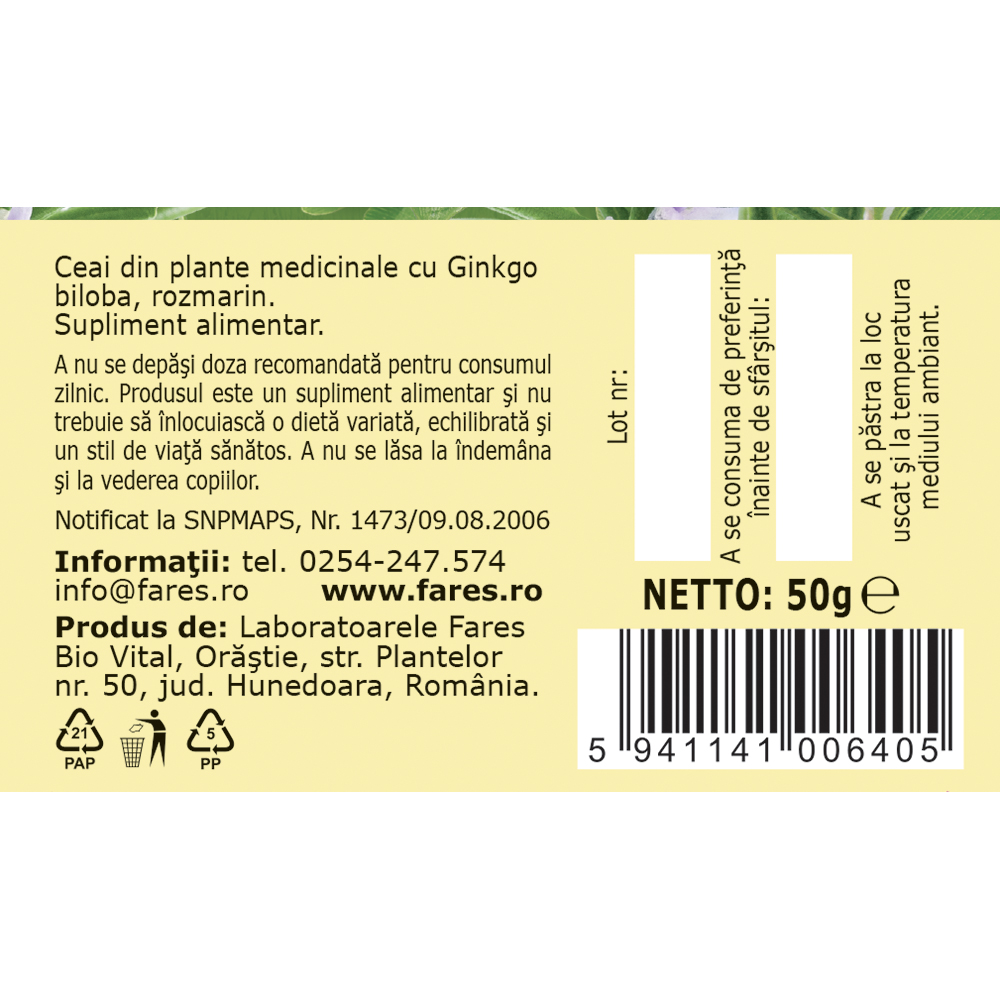 Ceaiul Circulatie Cerebrala N141 Fares este un supliment alimentar pe baza de plante medicinale precum Ginkgo biloba, paducel, sulfina si rozmarin. Contribuie la sustinerea circulatiei sanguine si la mentinerea functiilor cognitive normale, fiind potrivit pentru un stil de viata activ si echilibrat.