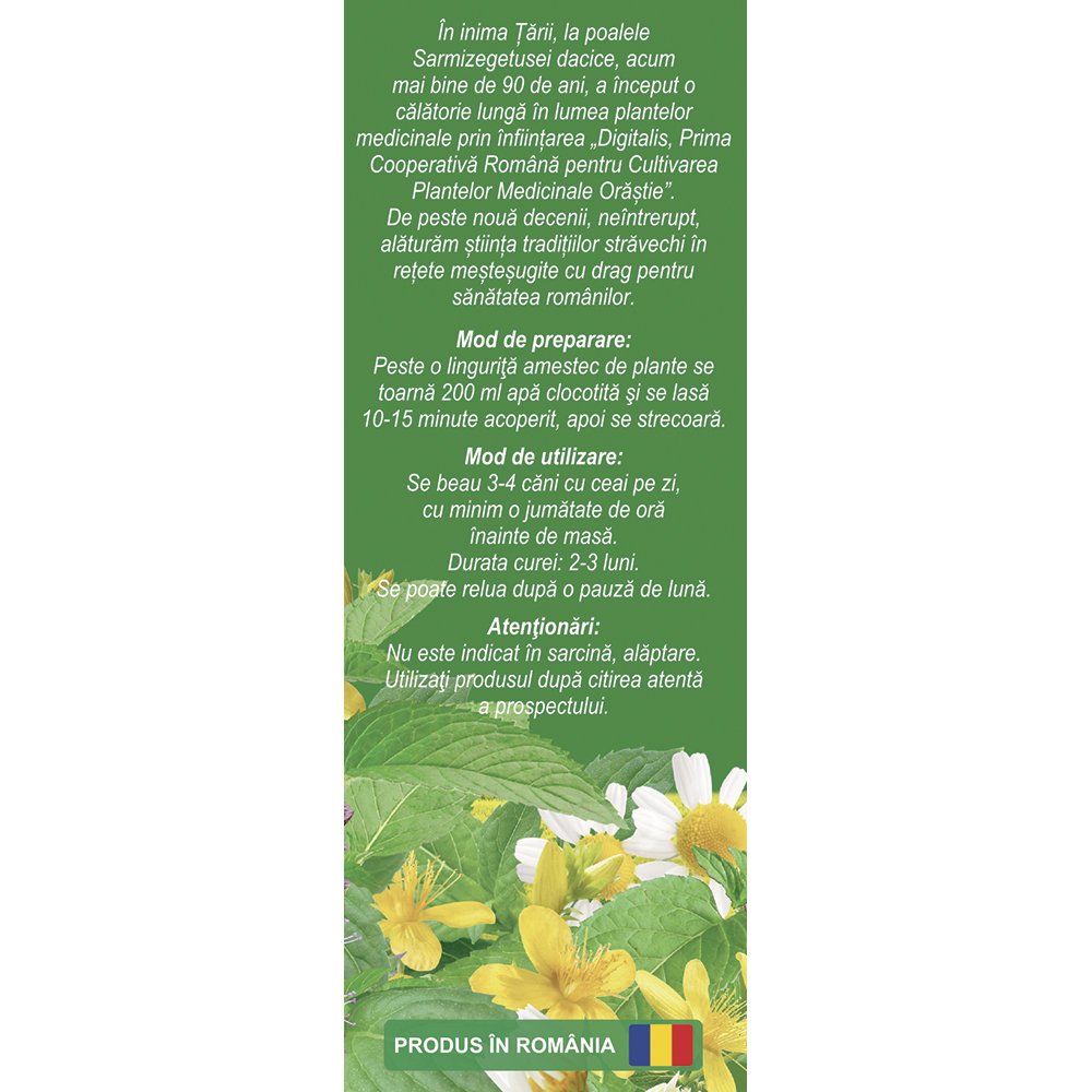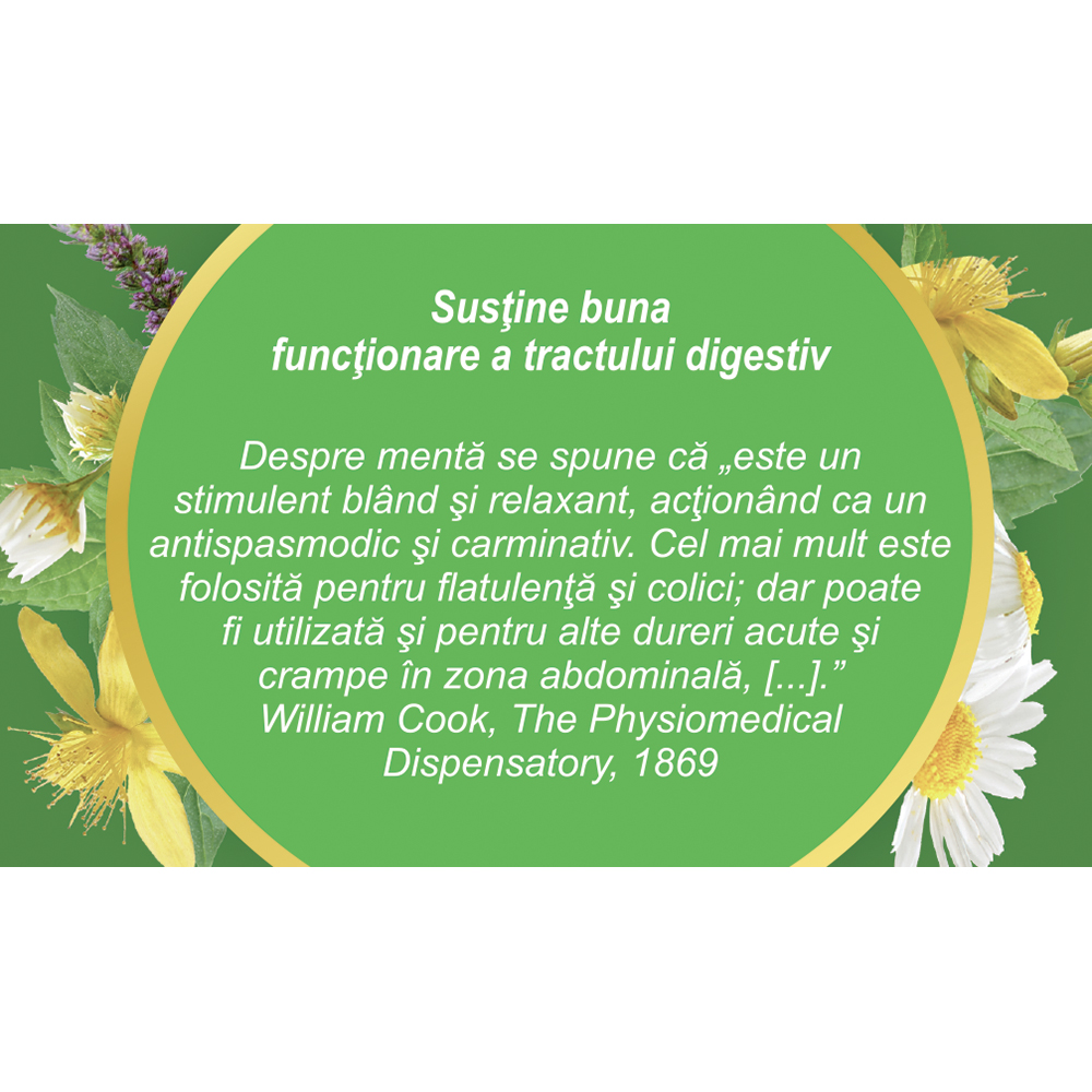 Contribuie la echilibrarea organismului prin combinația de plante cu efect calmant și digestiv.