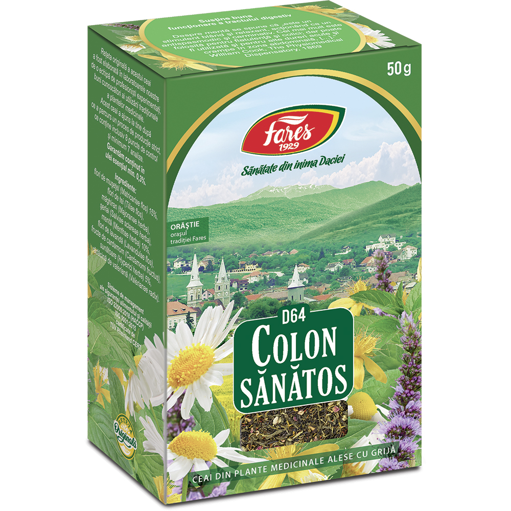 Ceaiul Colon Sănătos Fares este un supliment alimentar pe bază de plante medicinale atent selecționate, precum mușețel, tei, mentă și valeriană. Formula tradițională este destinată susținerii confortului digestiv și a echilibrului general al organismului.