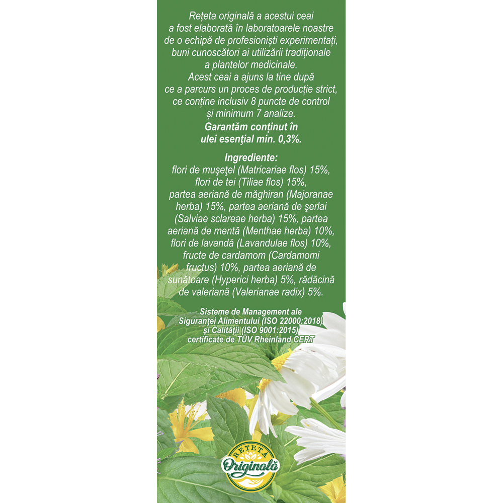 flori de mușețel (Matricariae flos) 15%, flori de tei (Tiliae flos) 15%, partea aeriană de măghiran (Majoranae herba) 15%, partea aeriană de șerlai (Salviae sclareae herba) 15%, partea aeriană de mentă (Menthae herba) 10%, flori de lavandă (Lavandulae flos) 10%, fructe de cardamom (Cardamomi fructus) 10%, partea aeriană de sunătoare (Hyperici herba) 5%, rădăcină de valeriană (Valerianae radix) 5%.