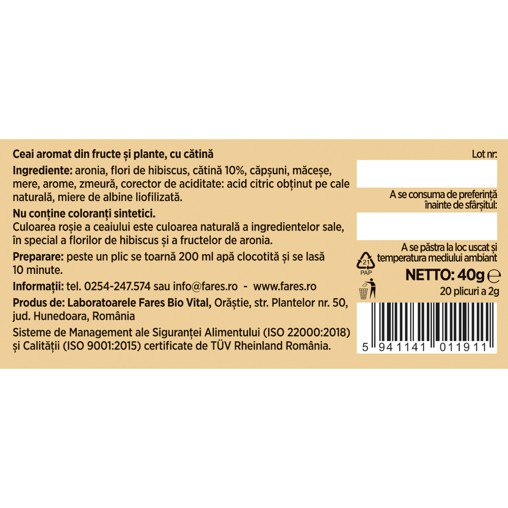 Ceaiul are o culoare roșie, naturală, datorată florilor de hibiscus și a fructelor de aronia.