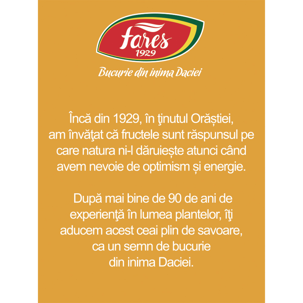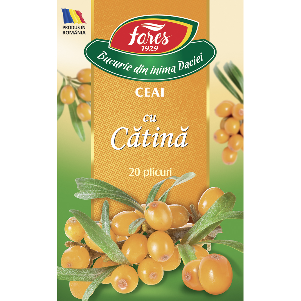 Ceaiul cu cătină de la Fares 1929 este un amestec aromat de fructe și plante, ce combină gustul revigorant al cătinei cu note dulci de fructe de pădure, oferind o băutură plină de savoare.
