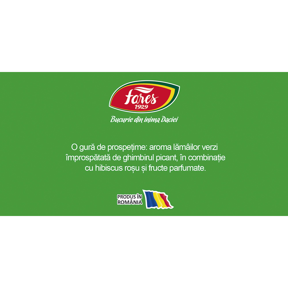 Ceaiul Aromfruct cu Ghimbir și Lămâi Verzi de la Fares 1929 este un amestec aromat de fructe și plante. Combină notele picante de ghimbir cu prospețimea lămâilor verzi, oferind o băutură cu o aromă vibrantă și revigorantă.