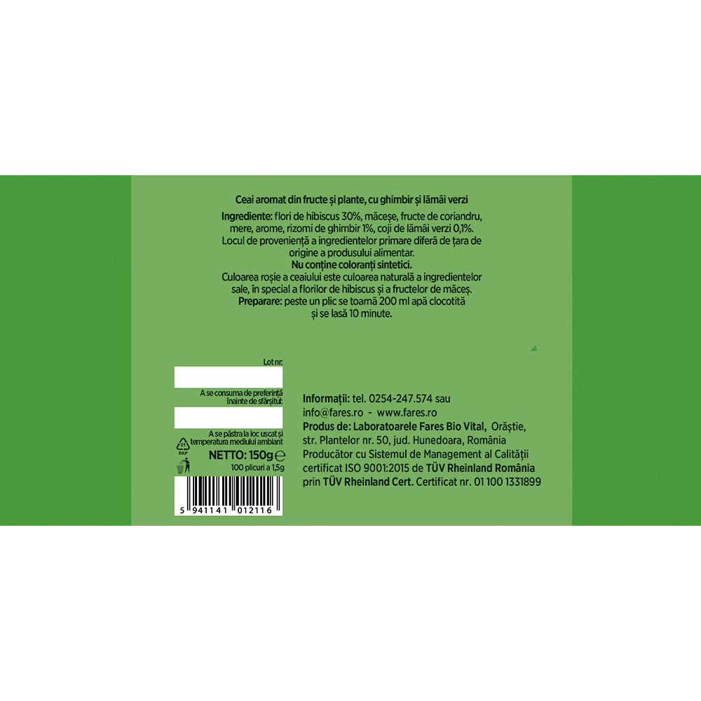 flori de hibiscus 30%, măceșe, fructe de coriandru, mere, arome, rizomi de ghimbir 1%, coji de lămâi verzi 0,1%.