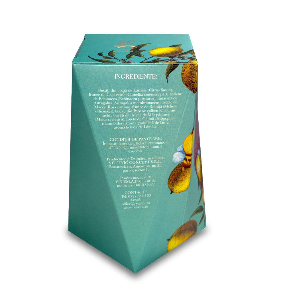Bucăți din coajă de Lămâie (Citrus limon), frunze de Ceai verde (Camellia sinensis), părți aeriene de Echinacea (Echinacea purpurea), rădăcină de Astragalus (Astragalus membranaceus), fructe de Măceș (Rosa canina), frunze de Roiniță (Melissa officinalis), bucăţi din Pepene galben (Cucumis melo), bucăți din fructe de Măr pădureț (Malus sylvestris), fructe de Cătină (Hippophae rhamnoides), aromă granulată de Lime, aromă lichidă de Lămâie.