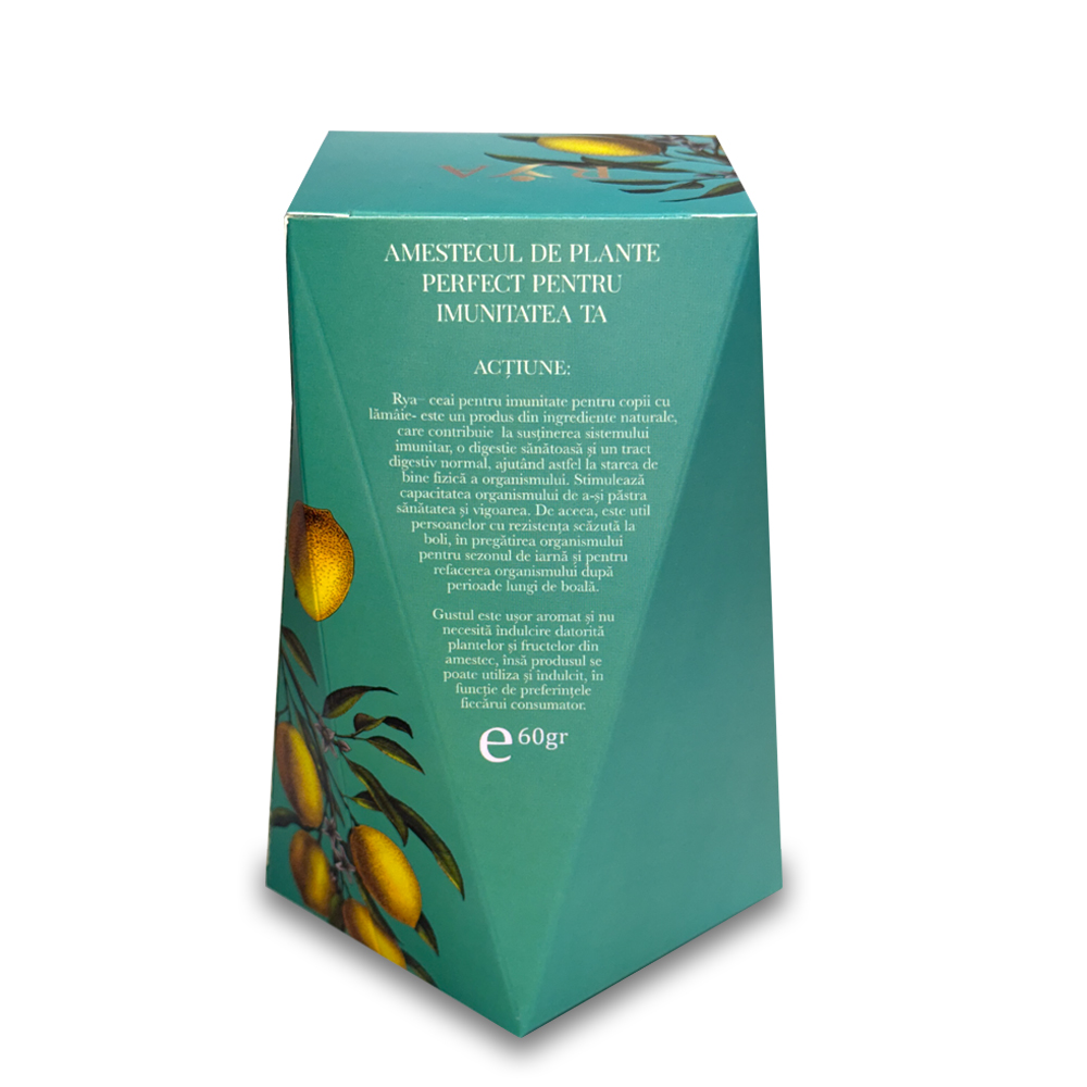 Rya Ceai pentru imunitate pentru copii cu lămâie este un produs din ingrediente naturale, care contribuie la susţinerea sistemului imunitar, a unei digestii sănătoase şi a unui tract digestiv normal, ajutând astfel la starea de bine fizică a organismului.