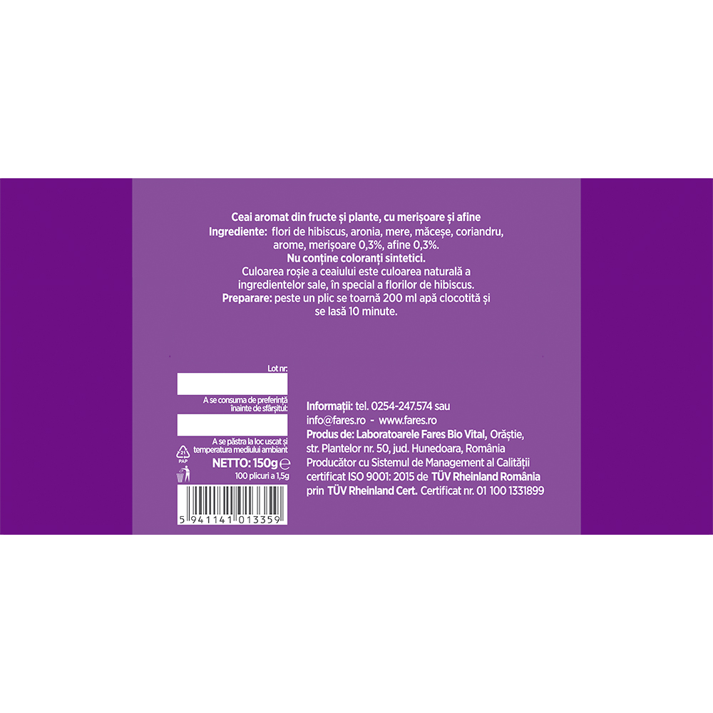 flori de hibiscus, aronia, mere, măceșe, coriandru, arome, merișoare 0,5%, afine 0,3%.
