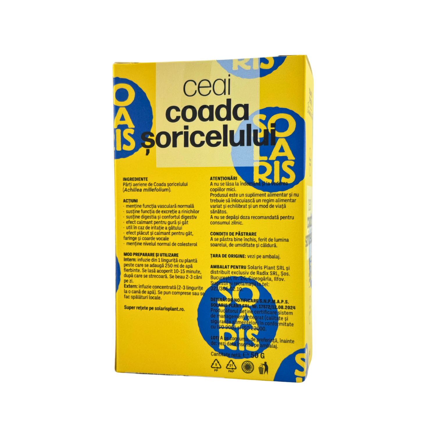 Produsul este un supliment alimentar și nu trebuie să înlocuiască un regim alimentar variat și echilibrat și un mod de viață sănătos.