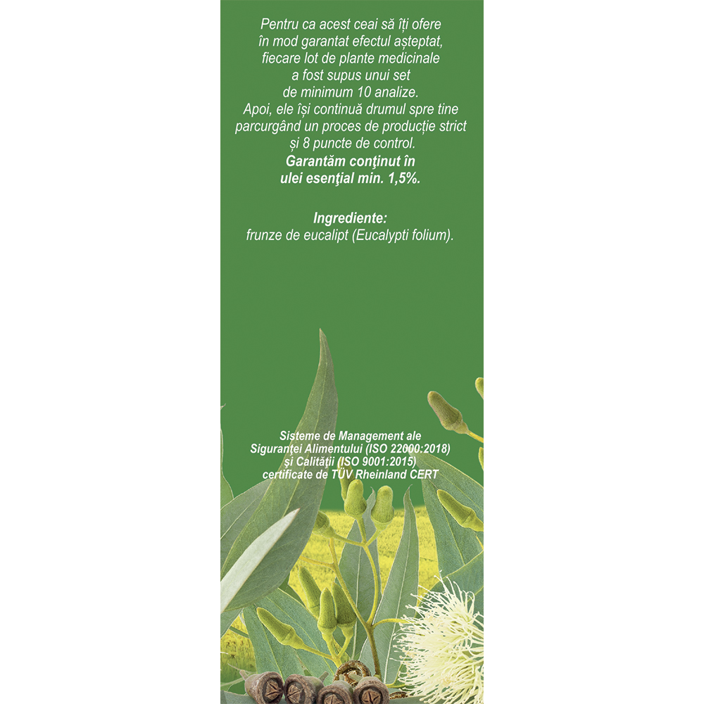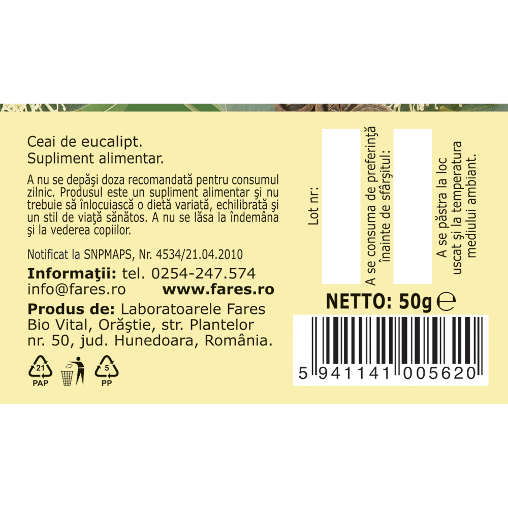 Ceaiul de eucalipt Fares R33 este un supliment alimentar pe bază de frunze de eucalipt (Eucalypti folium), recunoscut pentru conținutul său în ulei esențial. Este obținut din plante atent selecționate și procesate, contribuind la susținerea stării generale de bine și a confortului respirator.