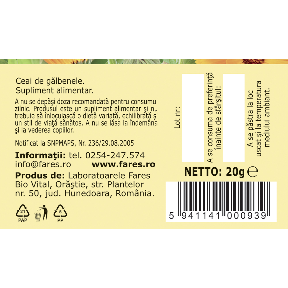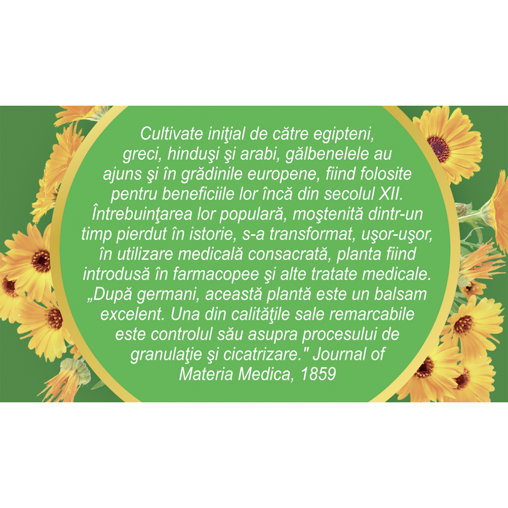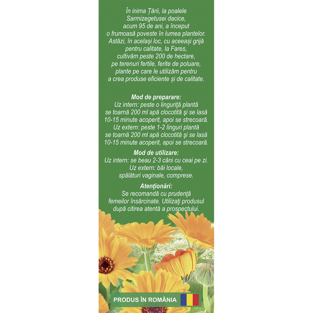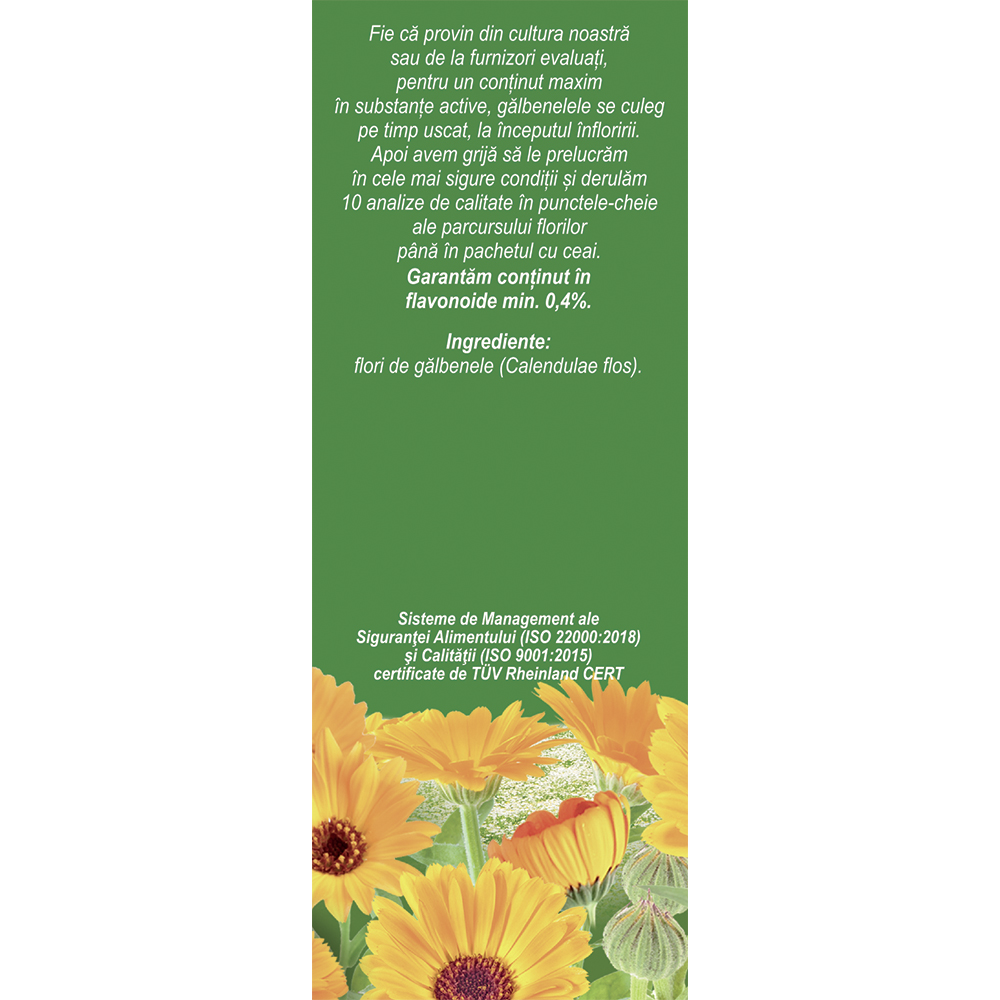 Ceaiul de gălbenele este un produs natural, obținut din plante atent cultivate pe terenuri fertile din România. Infuzia rezultată are un gust plăcut, ușor floral, fiind potrivit atât pentru consum zilnic, cât și pentru utilizări externe.