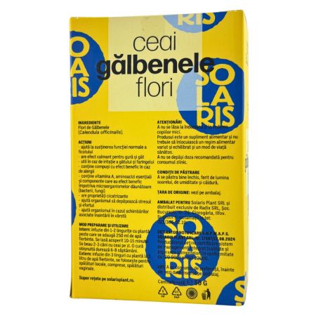 Ceaiul de Gălbenele flori Solaris este obținut din flori atent selecționate, care contribuie la funcționarea normală a ficatului și contribuie la menținerea confortului la nivelul gurii și gâtului. Consumul regulat contribuie la starea generală de bine, contribuie la echilibrul organismului în perioadele de stres și contribuie la menținerea sănătății pielii, fiind potrivit pentru utilizare internă și externă.