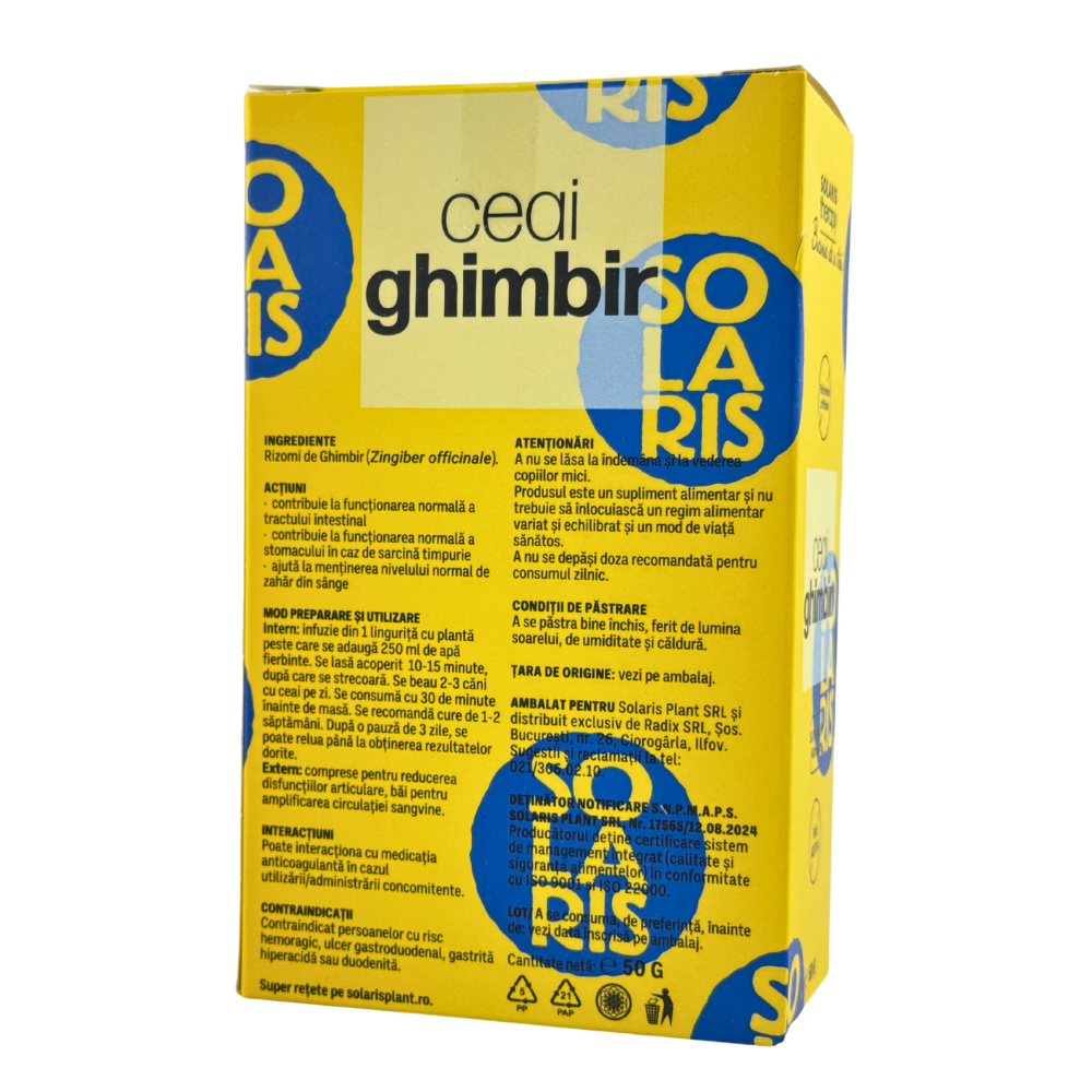 Ceaiul de Ghimbir Solaris este obținut din rizomi atent selecționați, care contribuie la digestia normală și contribuie la funcționarea normală a tractului intestinal. Consumul regulat contribuie la menținerea nivelului normal de zahăr din sânge, contribuie la vitalitatea organismului și contribuie la starea generală de bine, fiind potrivit pentru utilizare internă și externă.