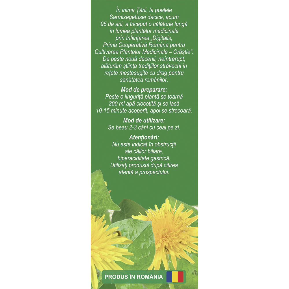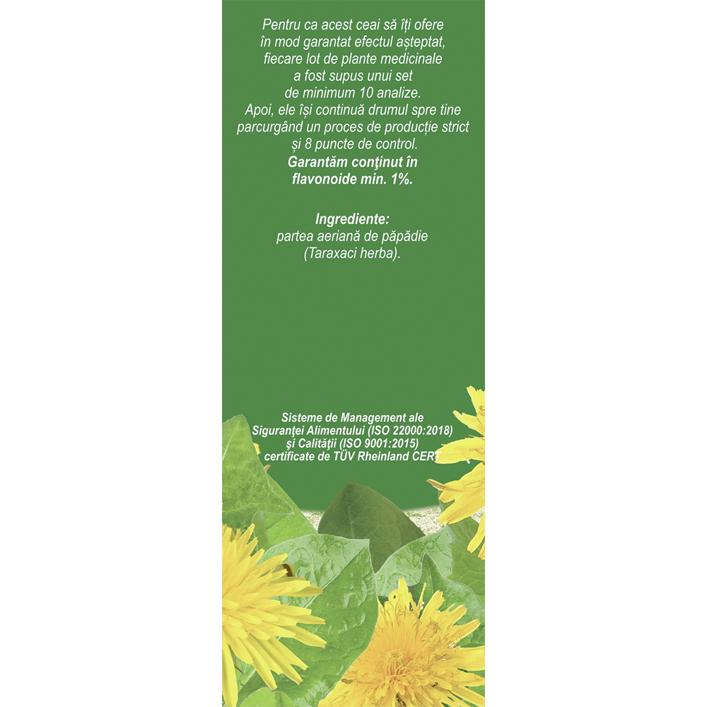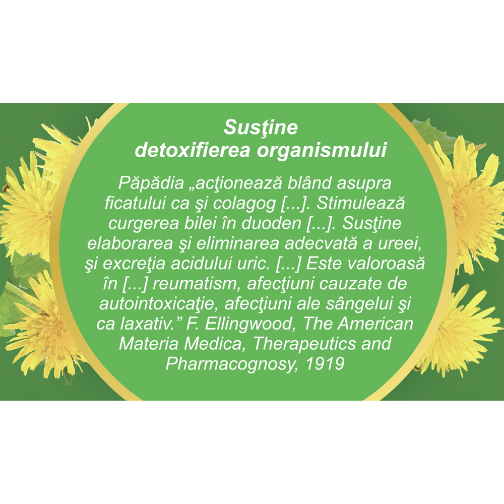 Ceaiul din păpădie (Taraxacum officinale) contribuie la funcționarea normală a stomacului și ficatului, susține sănătatea aparatului urinar și procesele naturale de detoxifiere prin diureză.