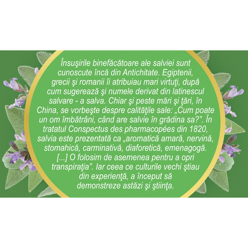 Ceai de salvie (Salviae herba) – supliment alimentar care contribuie la susținerea sănătății organismului. Conține min. 1% ulei esențial, obținut din plante cultivate și controlate riguros.