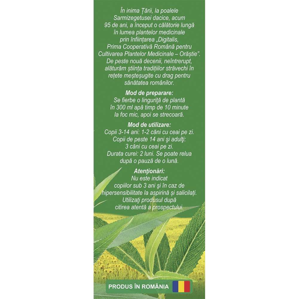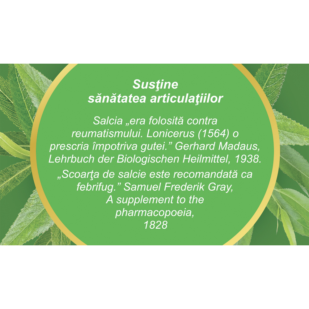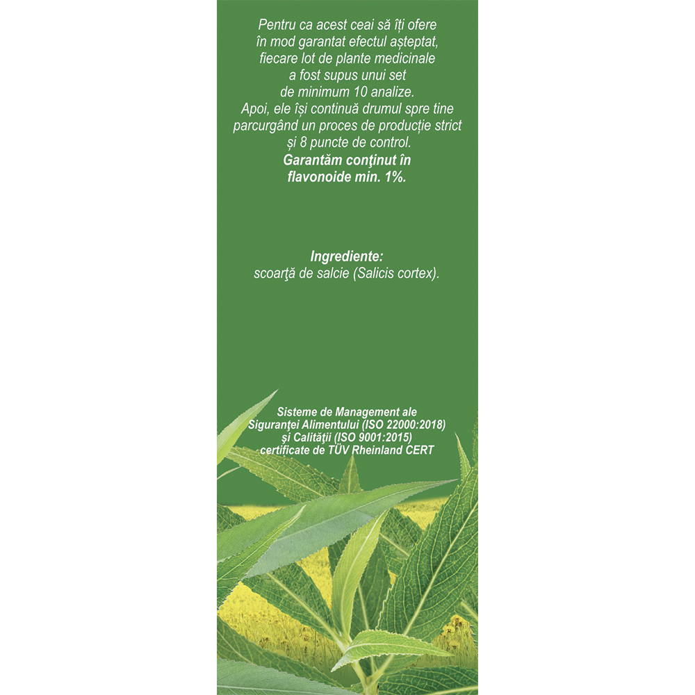 Ceai din scoarță de salcie (Salicis cortex), 100% natural, cu conținut garantat de flavonoide min. 1%, obținut printr-un proces riguros de selecție și control al calității.