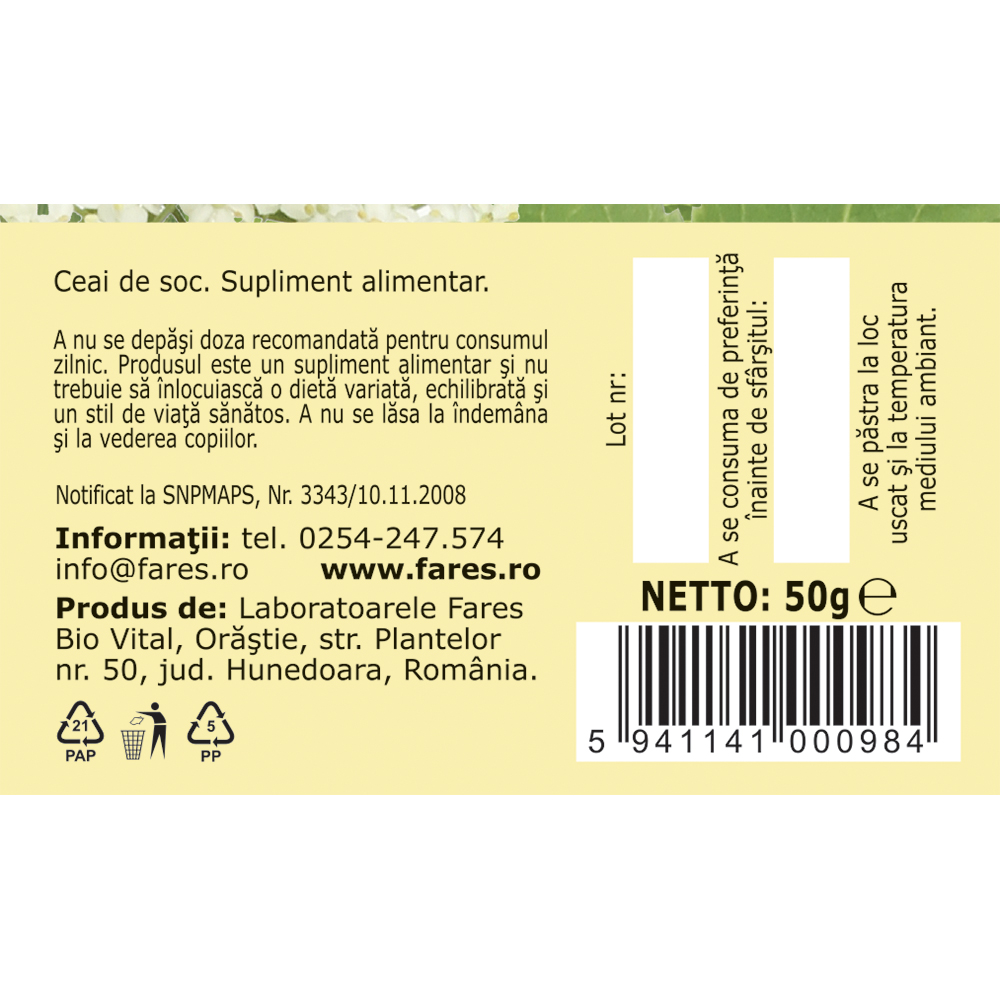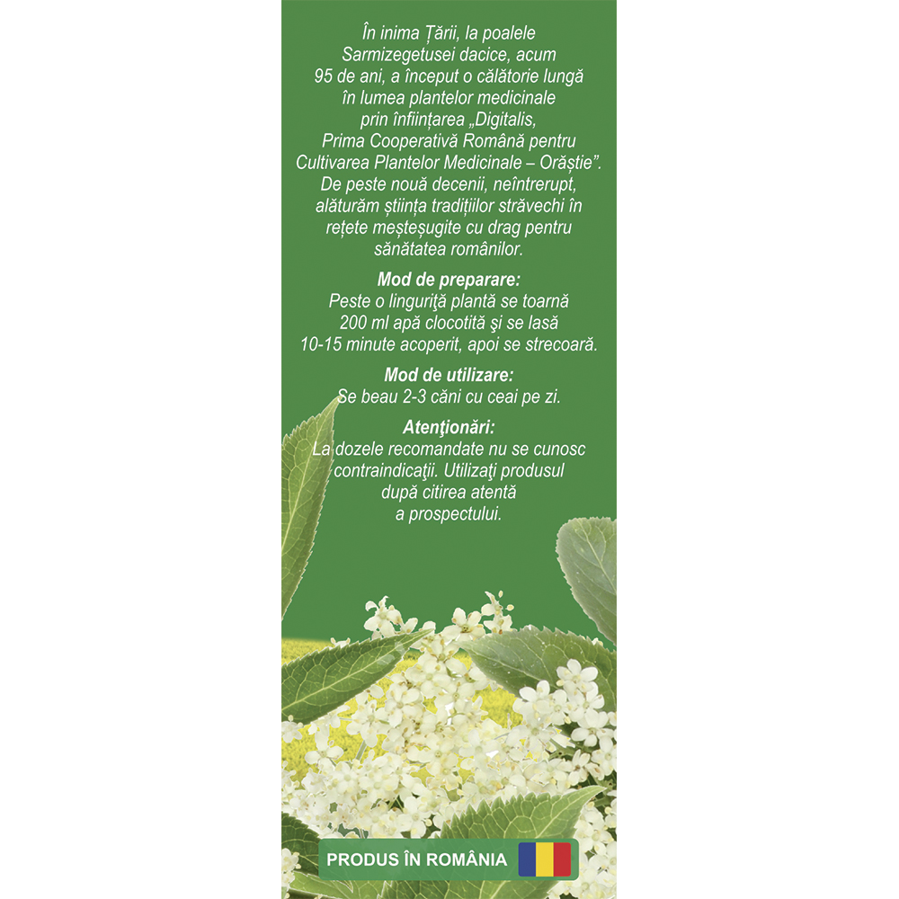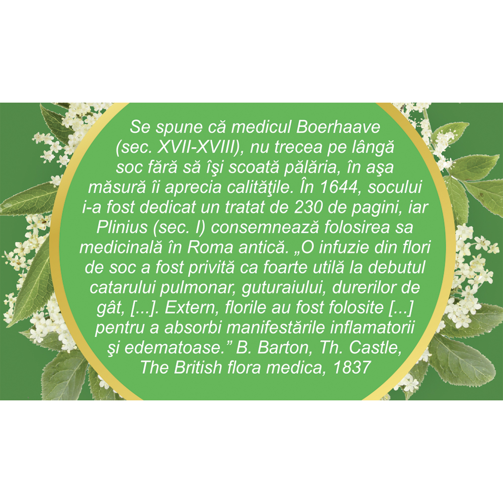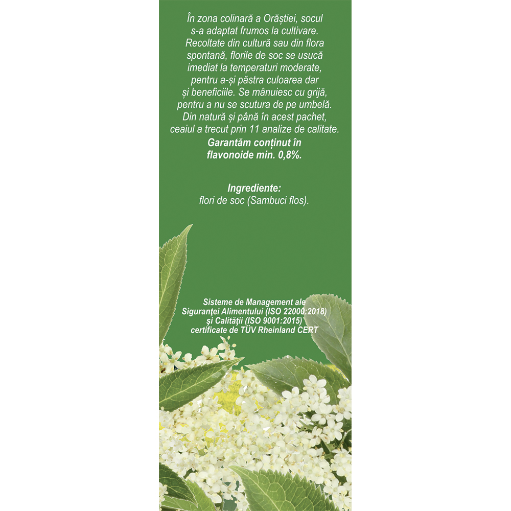 Ceaiul de soc este obținut din flori de soc atent selecționate și oferă o infuzie plăcută, cu aromă delicată și gust reconfortant. Acest ceai este potrivit pentru consumul zilnic, fiind o alegere naturală pentru cei care apreciază băuturile pe bază de plante.