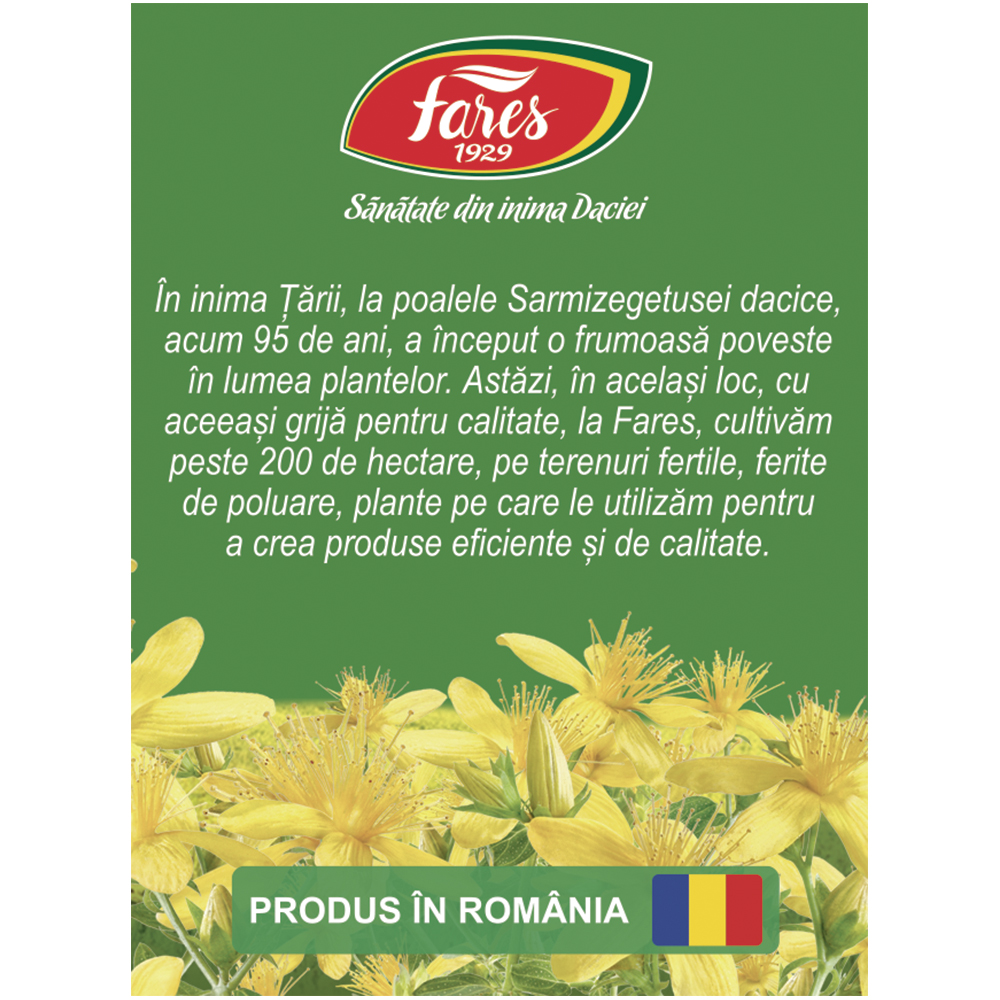 Ceaiul de sunătoare Fares este un supliment alimentar pe bază de plante, obținut din partea aeriană de Hyperici herba. Este apreciat pentru gustul său plăcut și pentru susținerea unei stări generale de bine, contribuind la relaxare și echilibru emoțional.