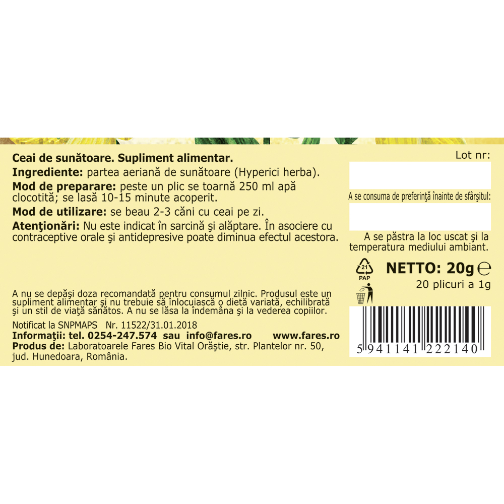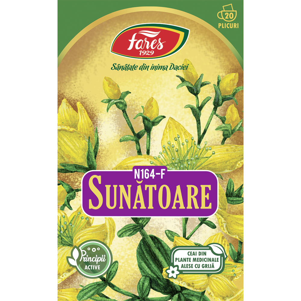 Ultima actualizare a informatiilor de prezentare pentru Ceai de Sunatoare, 20 plicuri, Fares a fost efectuata la data de 14-11-2025.  |  Raporteaza Descriere Gresita