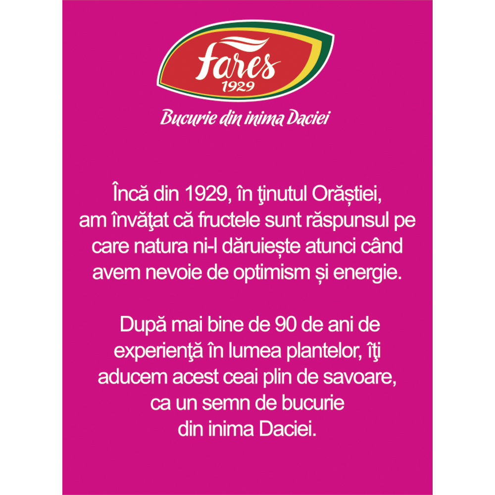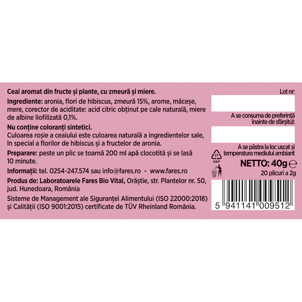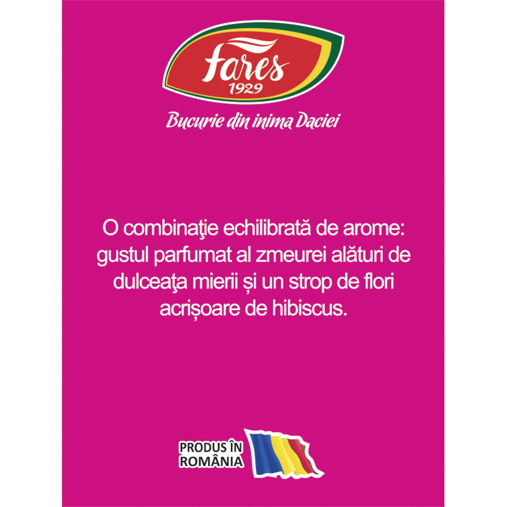 Ceaiul cu Zmeură și Miere de la Fares îmbină aroma intensă a zmeurei cu dulceața fină a mierii și notele acrișoare ale florilor de hibiscus. O băutură parfumată și reconfortantă, fără coloranți sintetici, potrivită pentru a fi savurată zilnic.