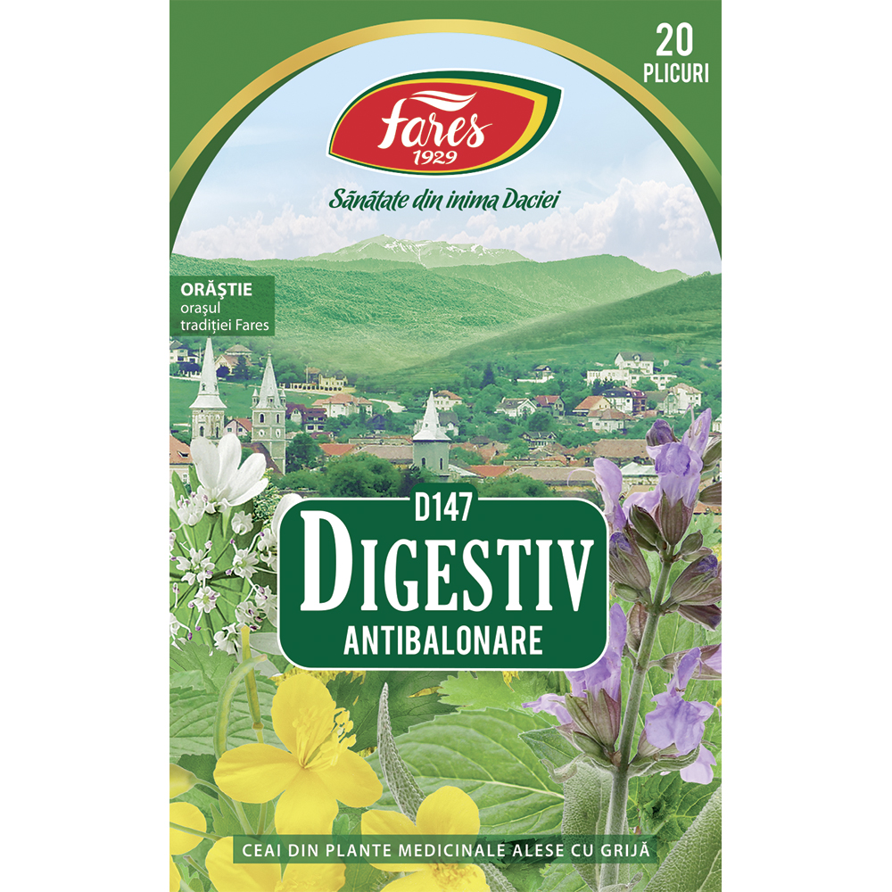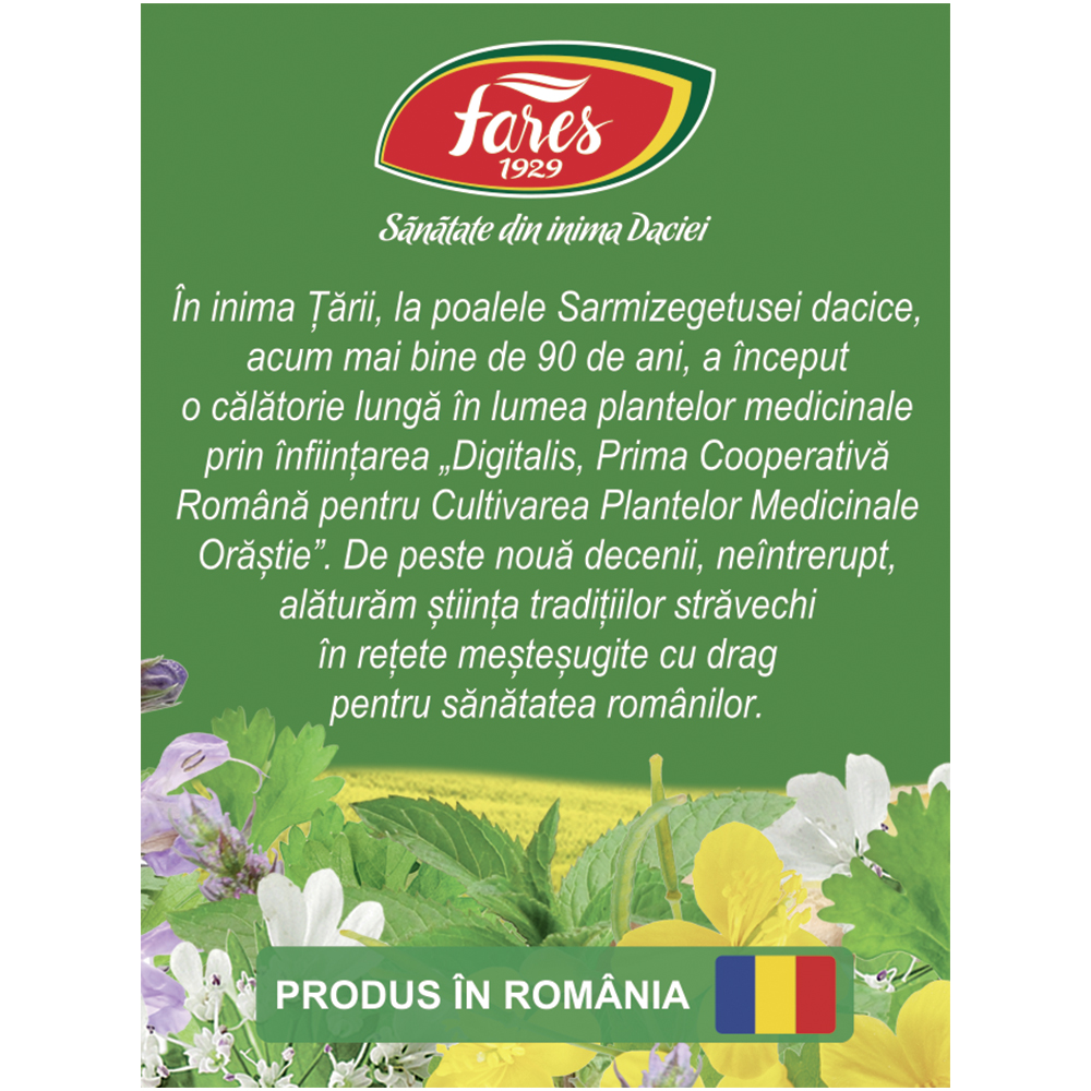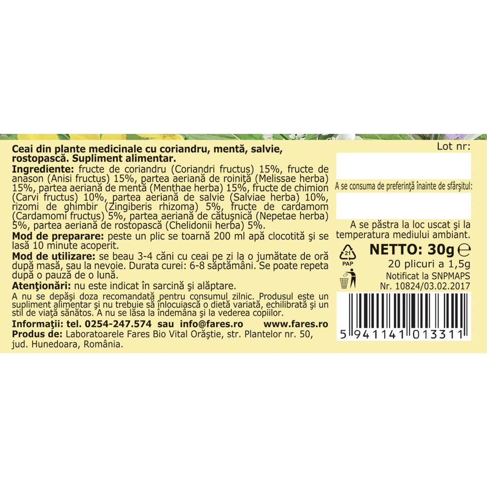 Suplimentul alimentar, un ceai din plante medicinale de la Fares 1929, este un amestec formulat cu grijă pentru a sprijini procesele digestive. Conține ingrediente precum coriandru, anason, mentă și chimion.