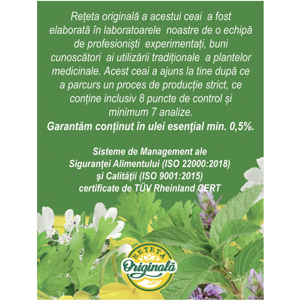 Mod de preparare: Peste un plic de ceai se toarnă 200 ml de apă clocotită. Se lasă la infuzat timp de 10 minute acoperit, apoi se consumă.