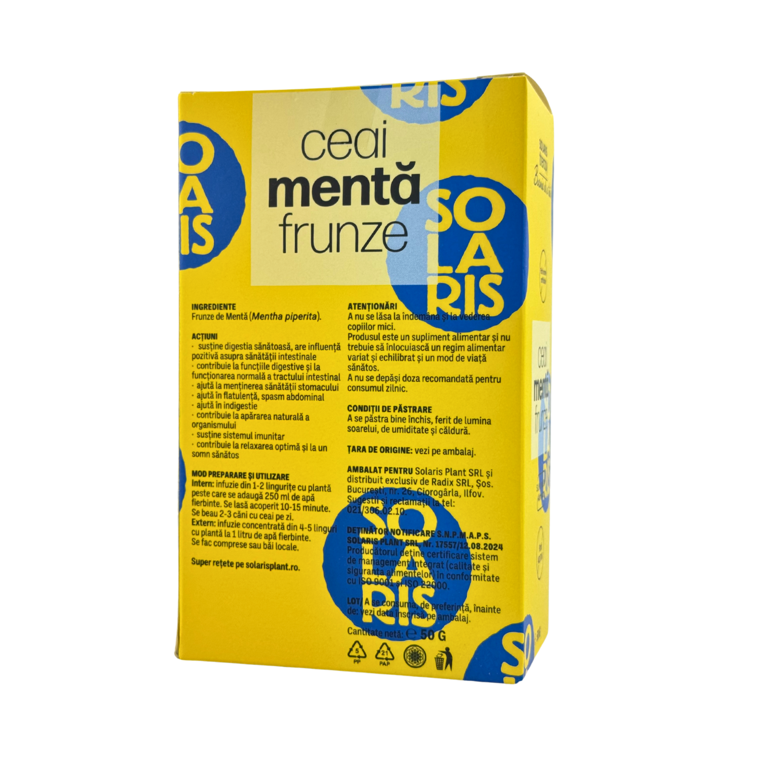Ultima actualizare a informatiilor de prezentare pentru Ceai din frunze de menta, 50 g, Solaris a fost efectuata la data de 14-04-2026.  |  Raporteaza Descriere Gresita