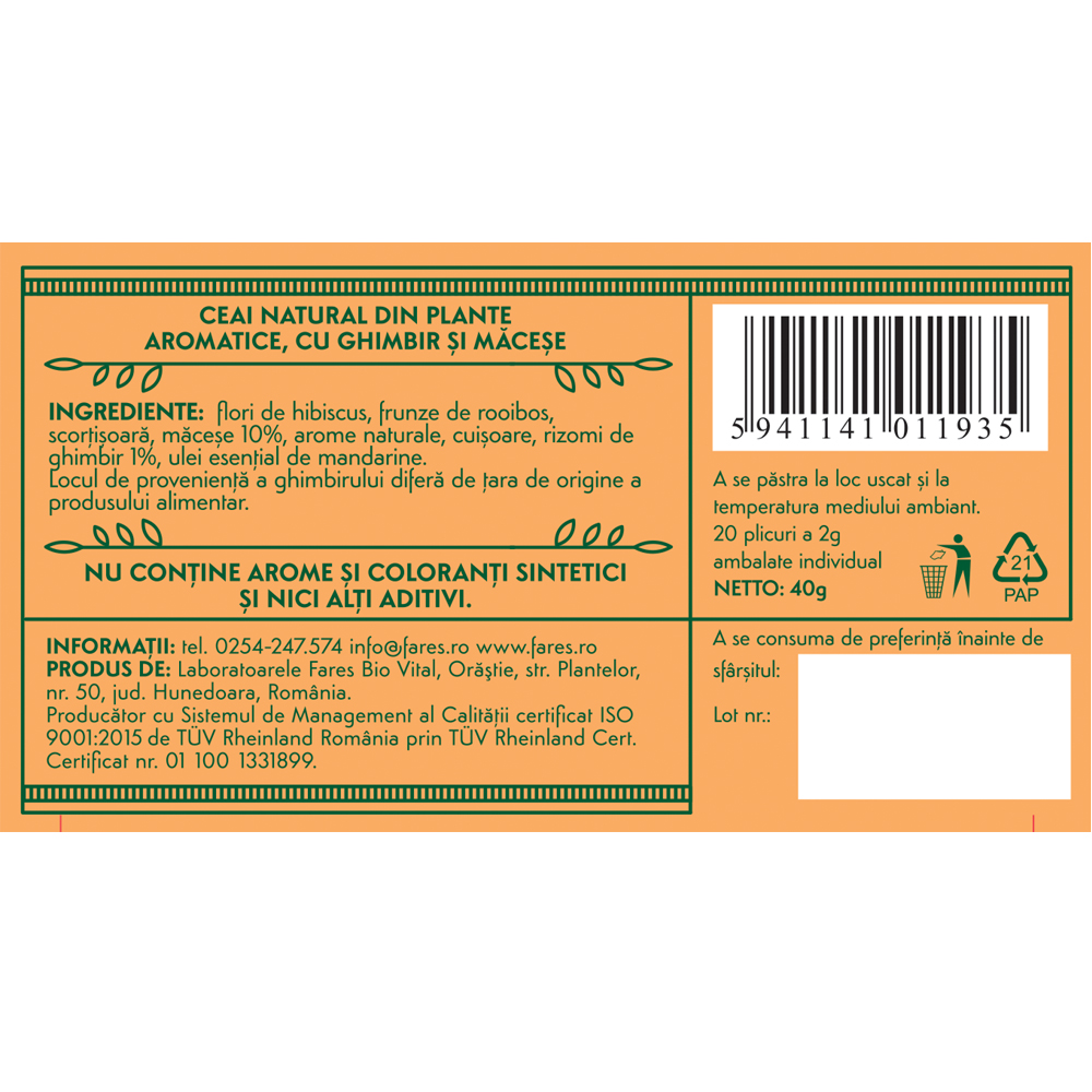 Flori de hibiscus, frunze de rooibos, scortisoară, măcese 10%, aromă naturală, cuișoare, rizomi de ghimbir 1%, ulei esențial de mandarine.