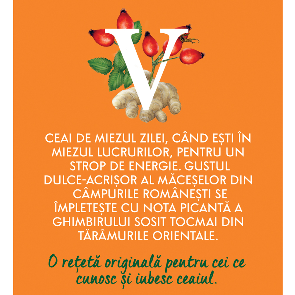 Ceaiul este o combinație de două arome diferite. Nota picantă a ghimbirului se îmbină armonios cu gustul dulce-acrișor al măceșelor. Amestecul potrivit pentru mai multă energie pe parcursul zilei.