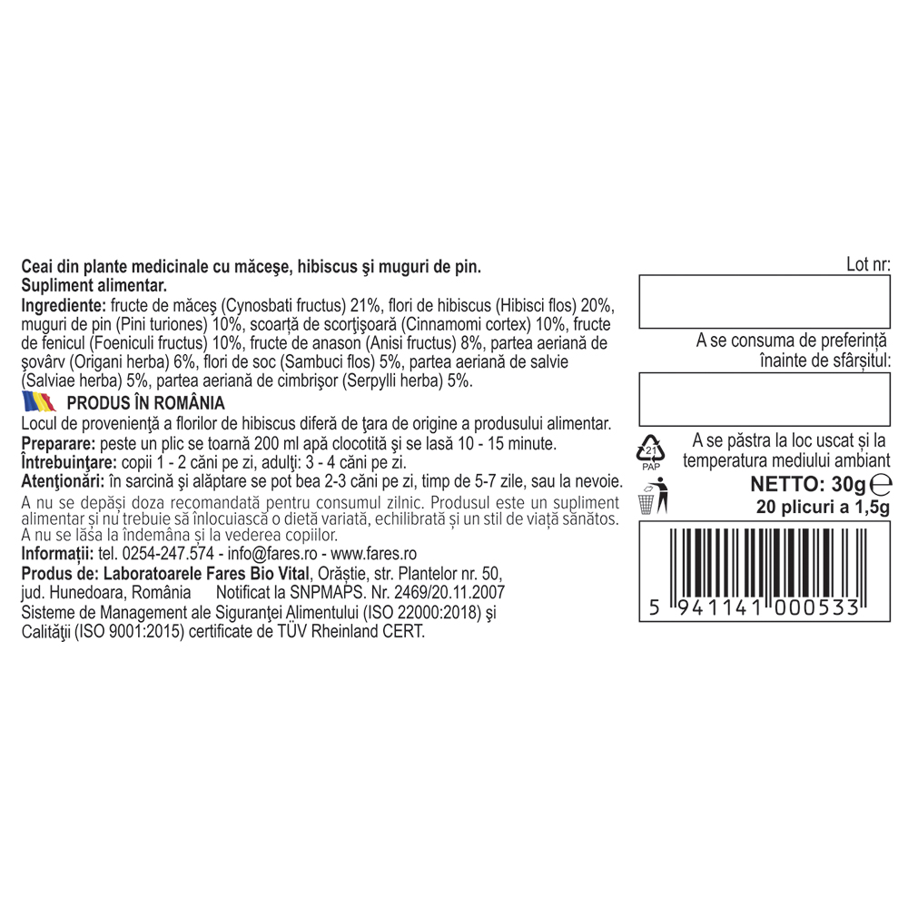 fructe de măceș (Cynosbati fructus) 21%, flori de hibiscus (Hibisci flos) 20%, muguri de pin (Pini turiones) 10%, scoarță de scorțișoară (Cinnamomi cortex) 10%