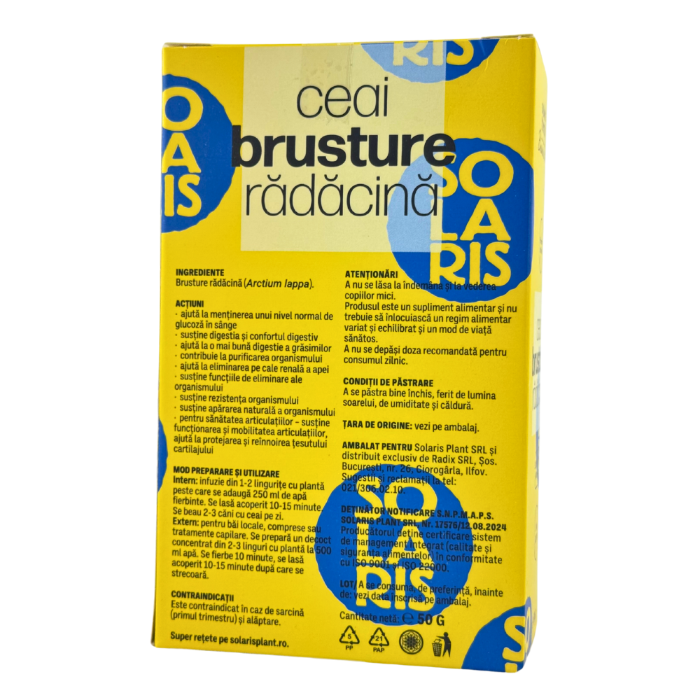 Ceaiul de Brusture rădăcină Solaris este obținut din rădăcini atent selecționate, care contribuie la menținerea nivelului normal de glucoză din sânge și contribuie la digestia normală. Consumul regulat contribuie la procesele naturale de eliminare ale organismului, contribuie la funcționarea normală a rinichilor și contribuie la starea generală de bine, fiind potrivit pentru utilizare internă și externă.