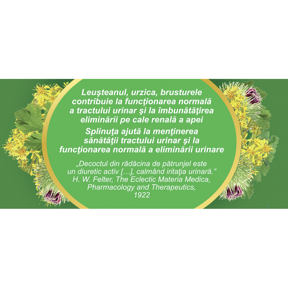 Leuşteanul, urzica și brusturele contribuie la funcționarea normală a tractului urinar și la îmbunătățirea eliminării apei pe cale renală. Splinuța ajută la menținerea sănătății tractului urinar și la funcționarea normală a eliminării urinare.