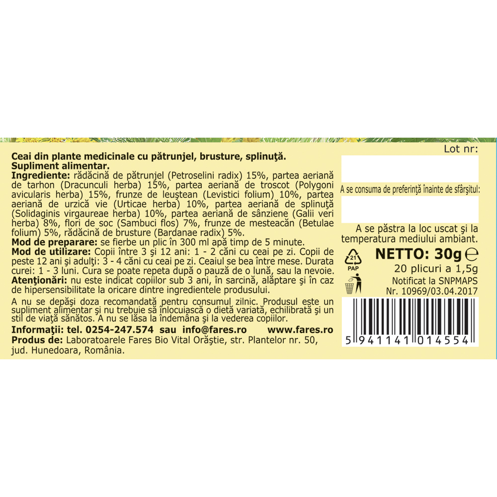 rădăcină de pătrunjel (Petroselini radix) 15%, partea aeriană de tarhon (Dracunculi herba) 15%, partea aeriană de troscot (Polygoni avicularis herba) 15%, frunze de leuștean (Levistici folium) 10%, partea aeriană de urzică vie (Urticae herba) 10%, partea aeriană de splinuță (Solidaginis virgaureae herba) 10%, partea aeriană de sânziene (Galii veri herba) 8%, flori de soc (Sambuci flos) 7%, frunze de mesteacăn (Betulae folium) 5%, rădăcină de brusture (Bardanae radix) 5%.