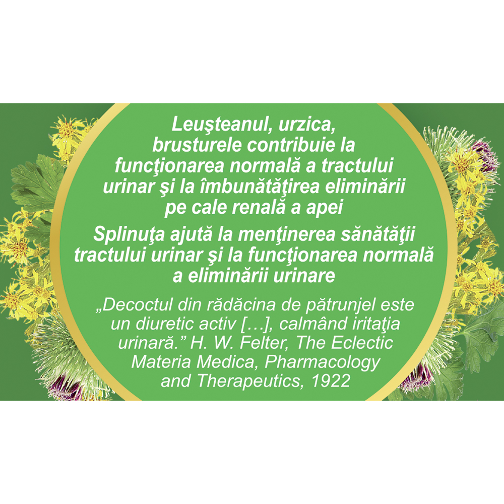 Leuşteanul, urzica și brusturele contribuie la funcționarea normală a tractului urinar și la îmbunătățirea eliminării pe cale renală a apei. De asemenea, splinuța contribuie la menținerea sănătății tractului urinar și la funcționarea normală a eliminării urinare.