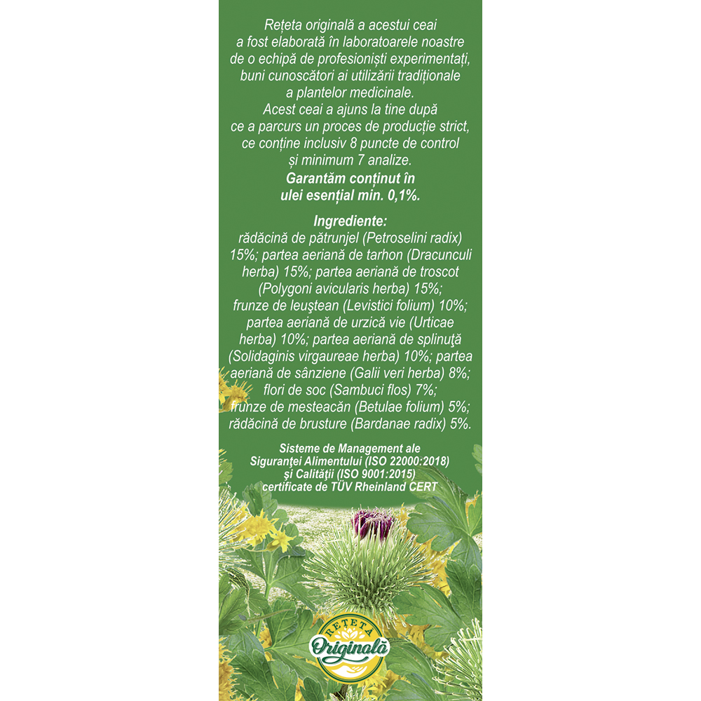 rădăcină de pătrunjel (Petroselini radix) 15%, partea aeriană de tarhon (Dracunculi herba) 15%, partea aeriană de troscot (Polygoni avicularis herba) 15%, frunze de leuștean (Levistici folium) 10%, partea aeriană de urzică vie (Urticae herba) 10%, partea aeriană de splinuță (Solidaginis virgaureae herba) 10%, partea aeriană de sânziene (Galii veri herba) 8%, flori de soc (Sambuci flos) 7%, frunze de mesteacăn (Betulae folium) 5%, rădăcină de brusture (Bardanae radix) 5%.