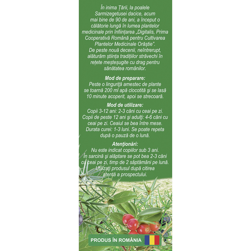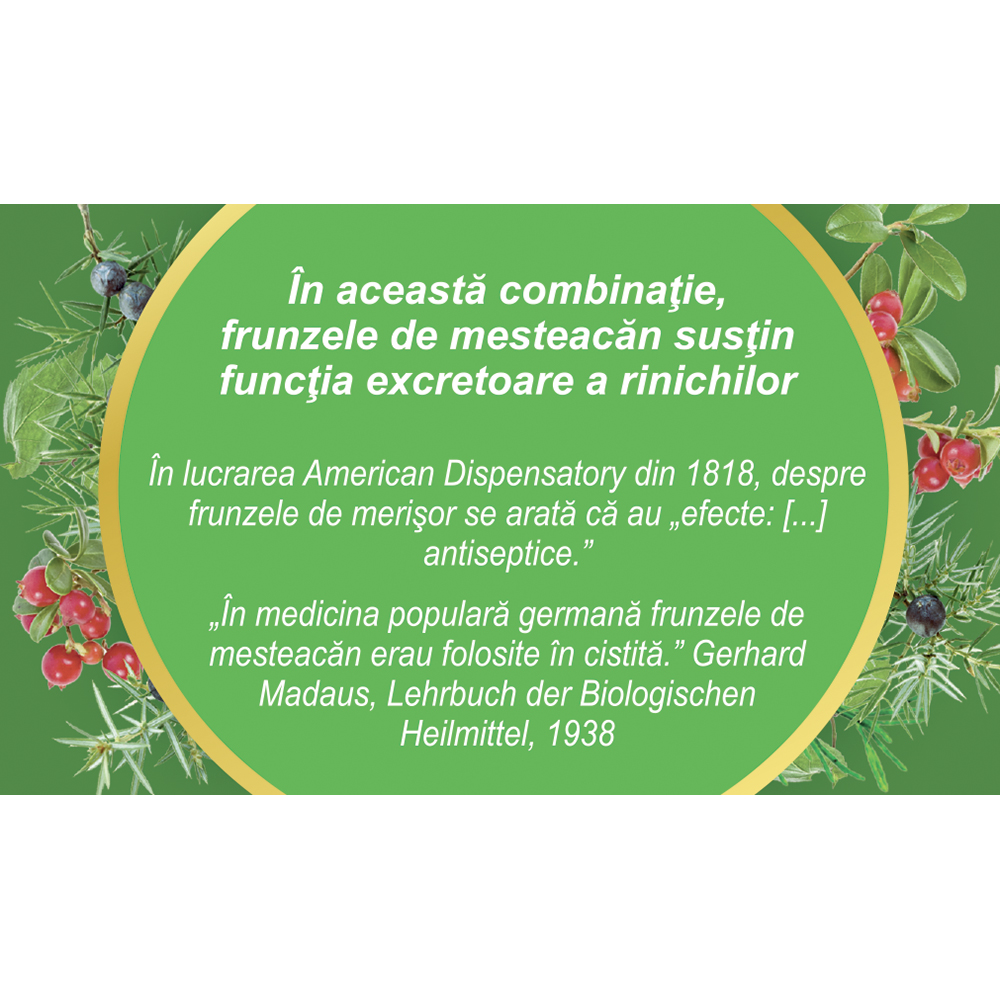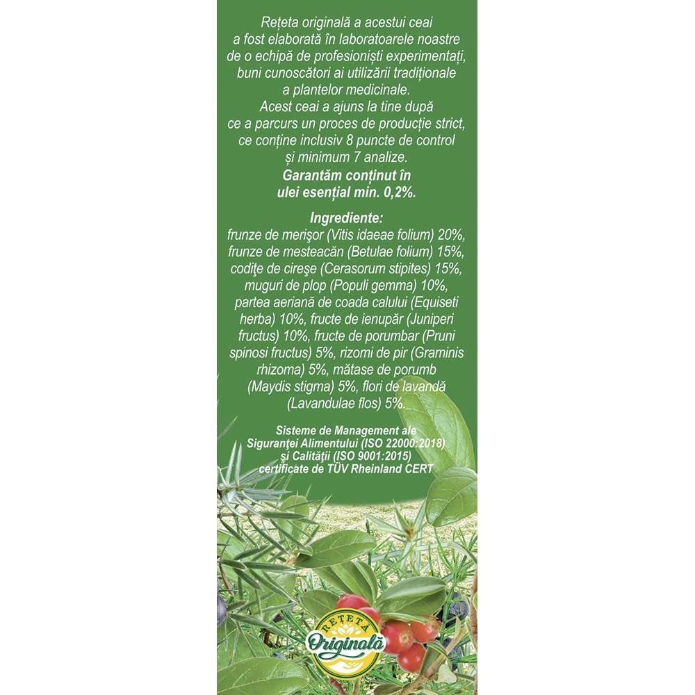 Frunze de merișor (Vitis idaeae folium) 20%, frunze de mesteacăn (Betulae folium) 15%, codițe de cireșe (Cerasorum stipites) 15%, muguri de plop (Populi gemma) 10%, partea aeriană de coada calului (Equiseti herba) 10%, fructe de ienupăr (Juniperi fructus) 10%, fructe de porumbar (Pruni spinosae fructus) 5%, rizomi de pir (Graminis rhizoma) 5%, mătase de porumb (Maydis stigma) 5%, flori de lavandă (Lavandulae flos) 5%.