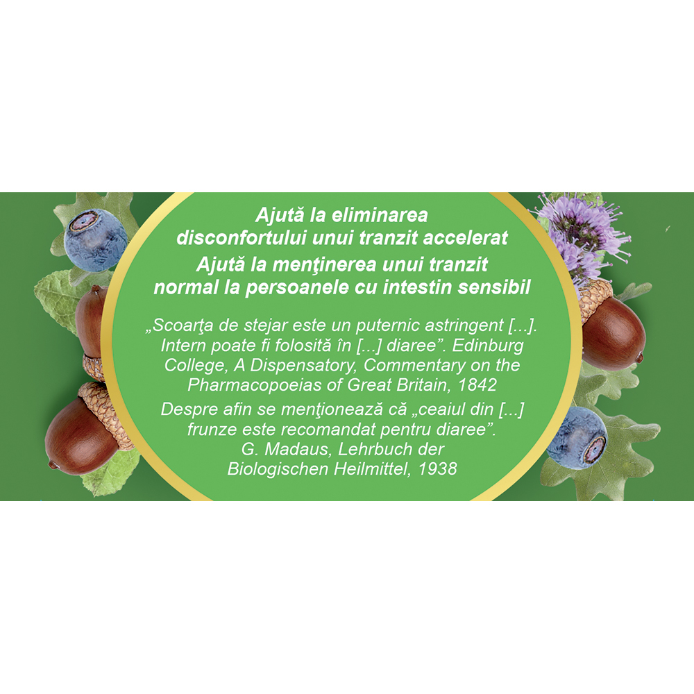Suplimentul alimentar Enterostop de la Fares 1929 este un ceai din plante medicinale, un amestec formulat cu grijă pentru a contribui la confortul digestiv. Printre ingredientele sale se numără scoarța de stejar, frunzele de afin și menta.