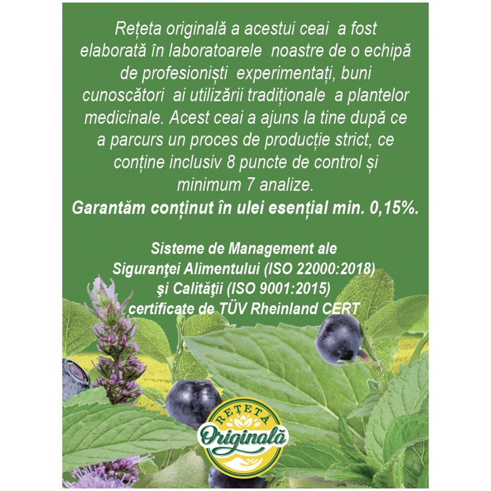 Mod de preparare: Peste un plic de ceai se toarnă 200 ml de apă clocotită. Se lasă la infuzat timp de 10-15 minute acoperit, apoi se consumă.