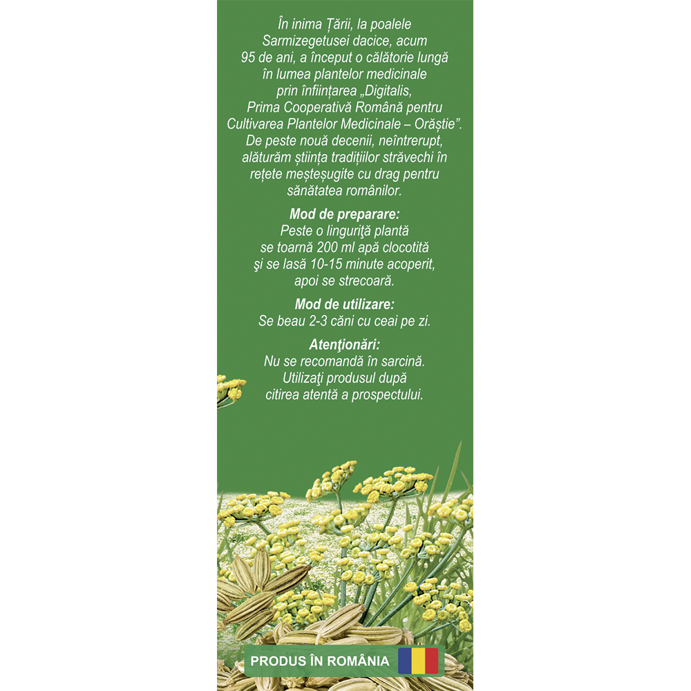 Ceai natural din fructe de fenicul (Foeniculum vulgare), cu un conținut garantat de 2% ulei esențial. Produs natural, din plante atent selecționate și controlate.