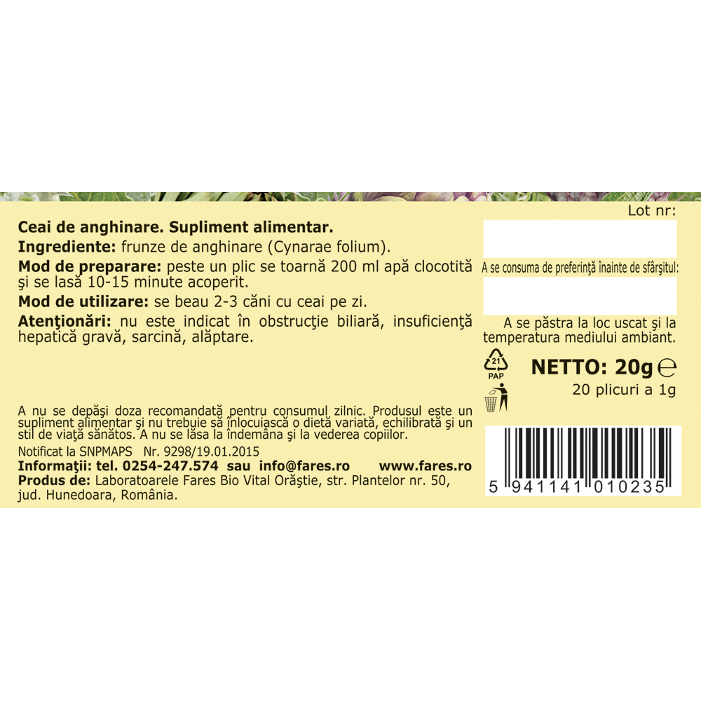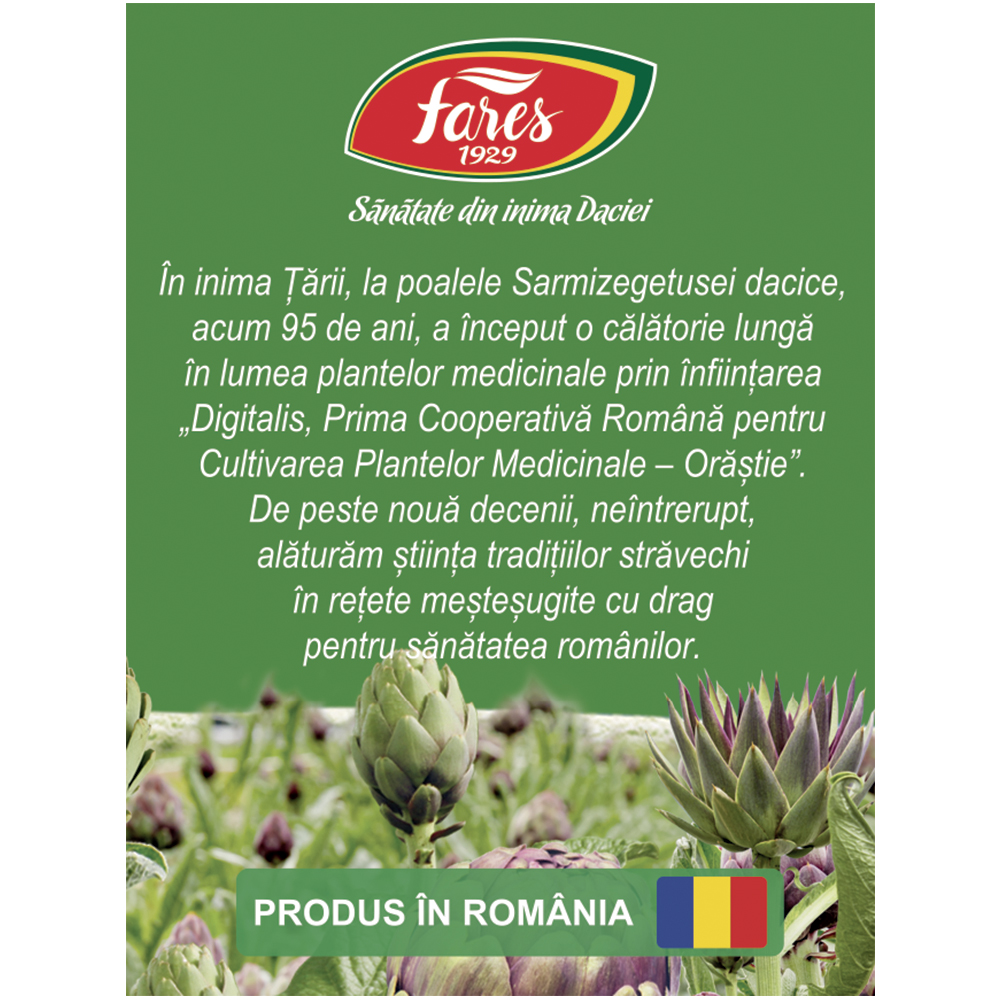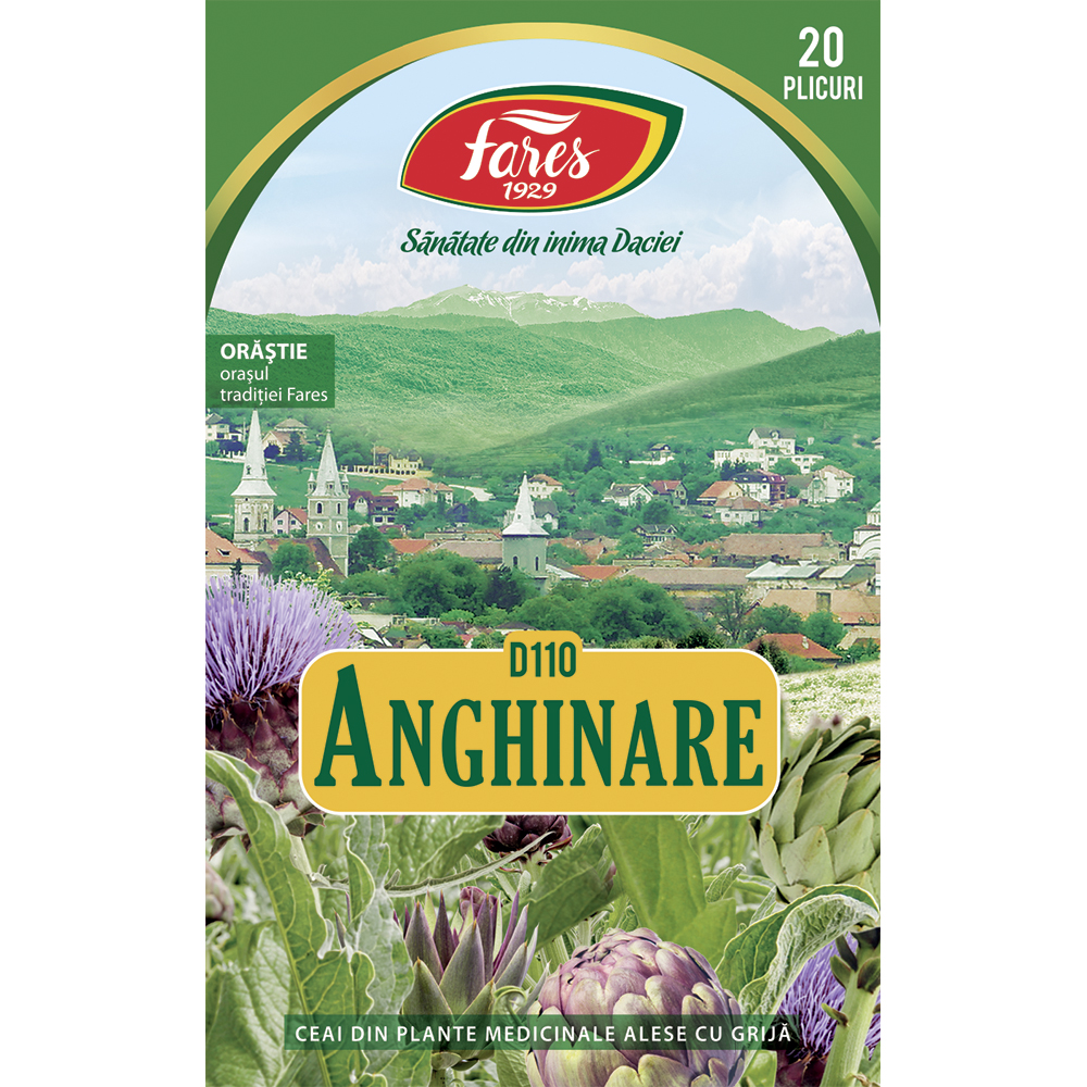 Ceaiul de anghinare Fares D110 este un supliment alimentar pe baza de frunze de anghinare (Cynarae folium), recunoscut pentru rolul sau in sustinerea functiei hepatice si a metabolismului lipidic. Plantele sunt selectionate cu grija si supuse unui control riguros al calitatii.