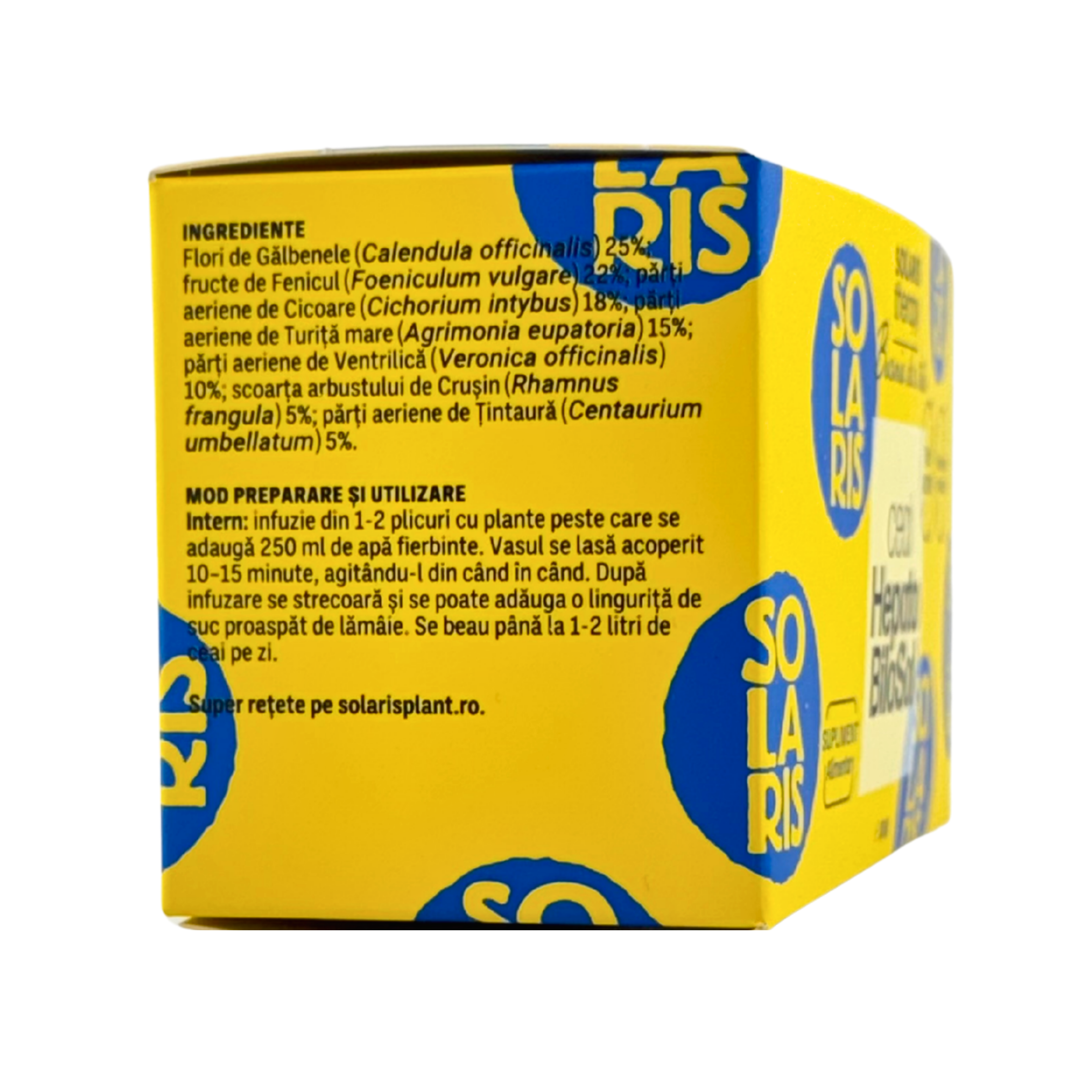 Ceaiul Hepato Bilosol Solaris este o formulă complexă din plante atent selecționate, care contribuie la funcționarea normală a ficatului și contribuie la menținerea sănătății hepatice. Ingredientele din compoziție contribuie la procesele fiziologice implicate în digestie, detoxifiere și eliminare, fiind recomandat ca parte a unui stil de viață echilibrat.
