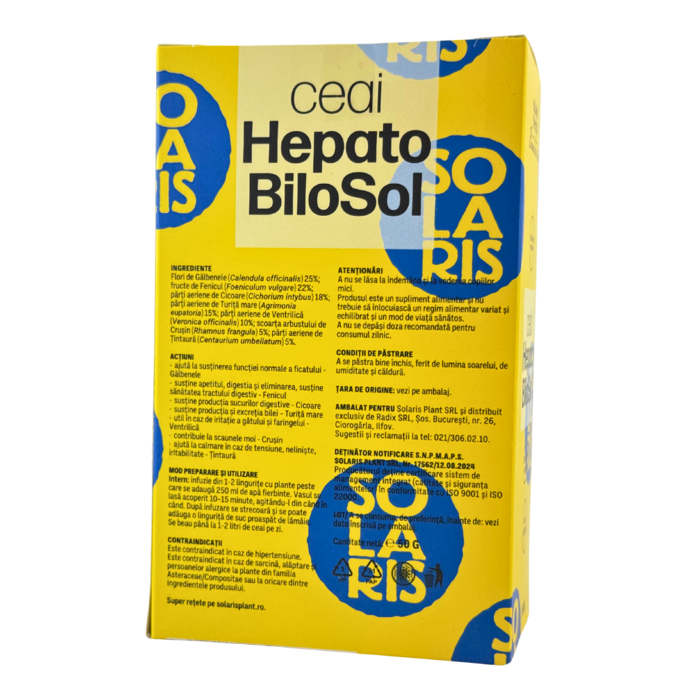 Ceaiul Hepato Bilosol Solaris este o formulă complexă din plante atent selecționate, care contribuie la funcționarea normală a ficatului și contribuie la menținerea sănătății hepatice. Compoziția sa contribuie la digestia normală, contribuie la procesele naturale de eliminare ale organismului și contribuie la starea generală de bine, fiind recomandată ca parte a unui stil de viață echilibrat.