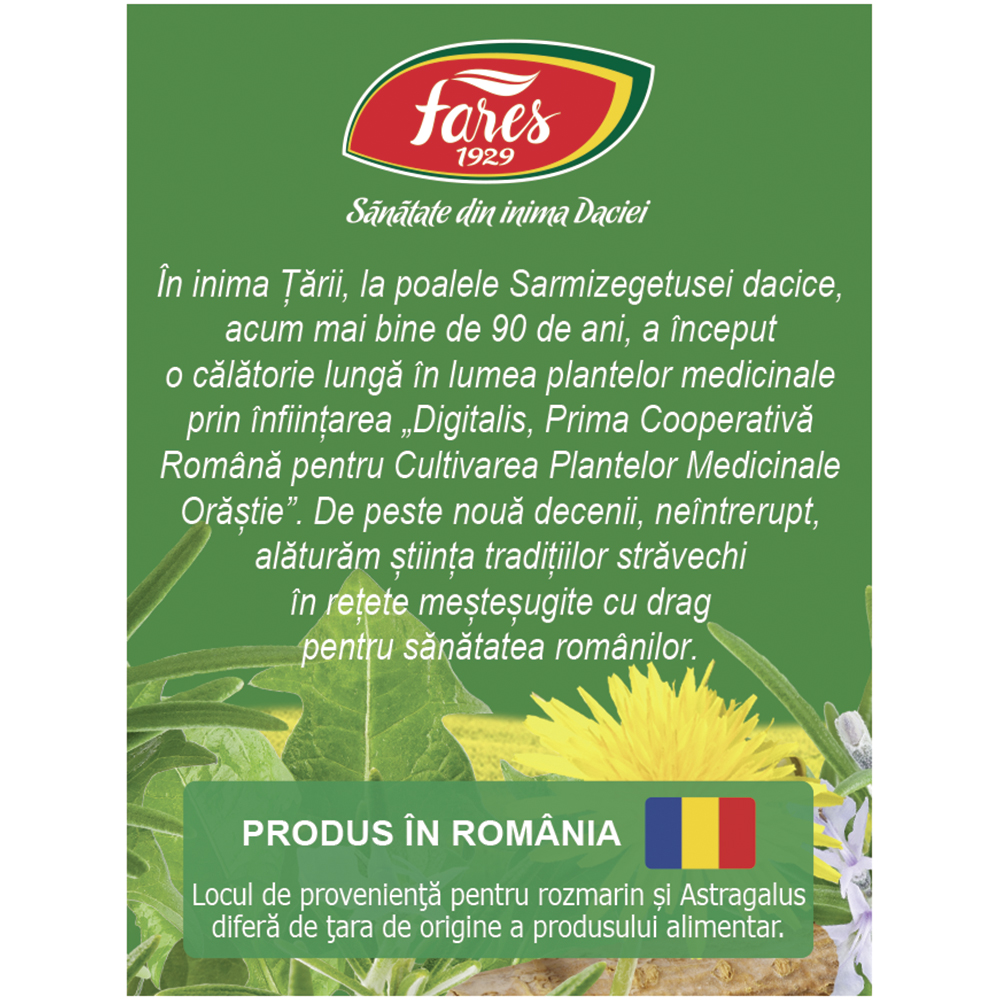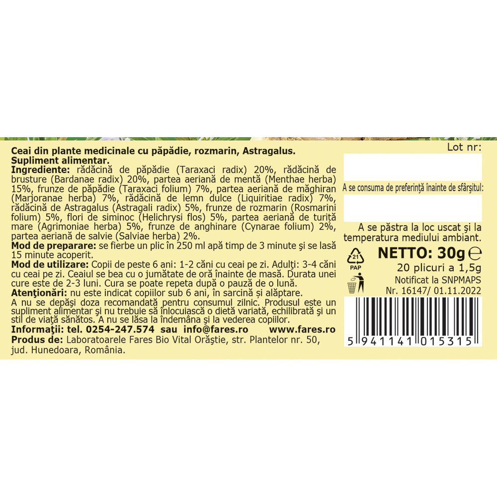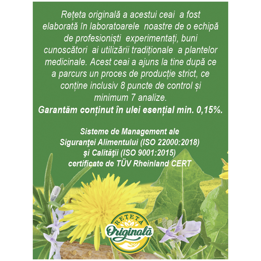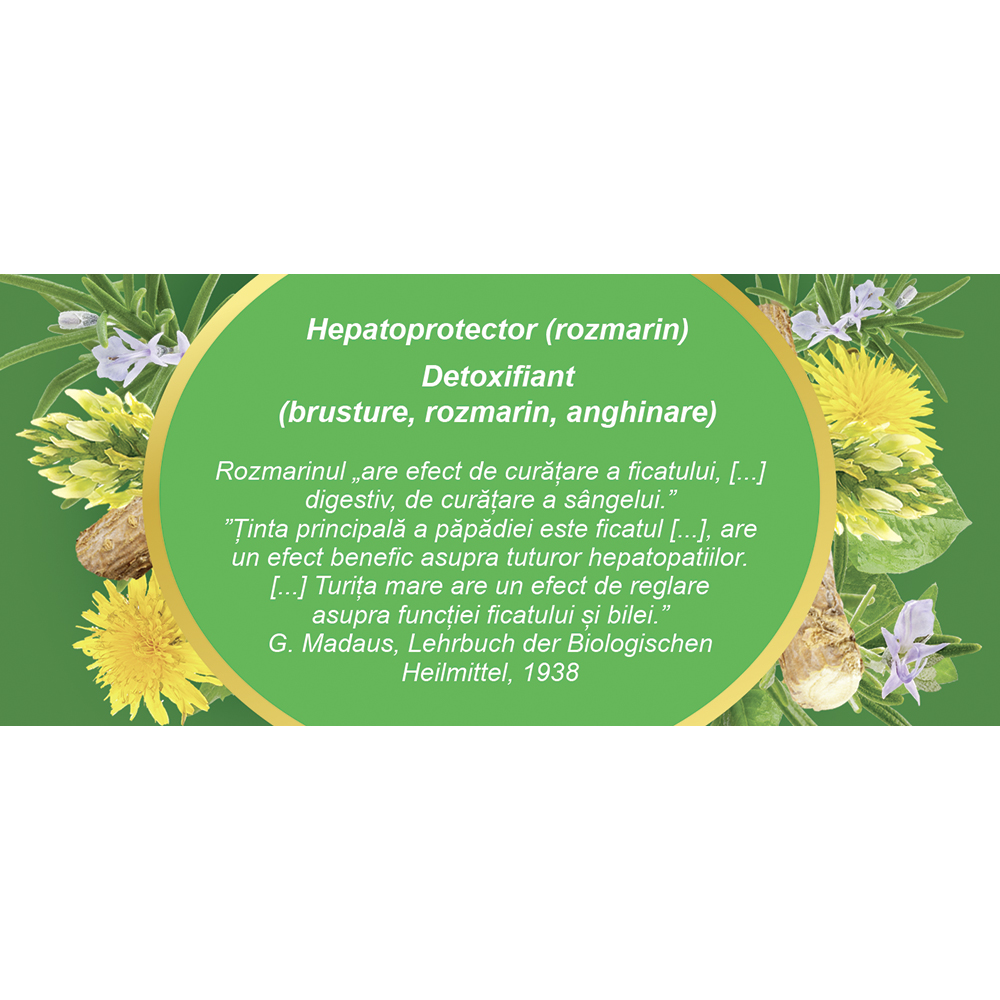 Poate contribuie la sustinerea detoxifierii, menținerea funcțiile fiziologice de purificare a organismului (brusture, rozmarin, anghinare).
