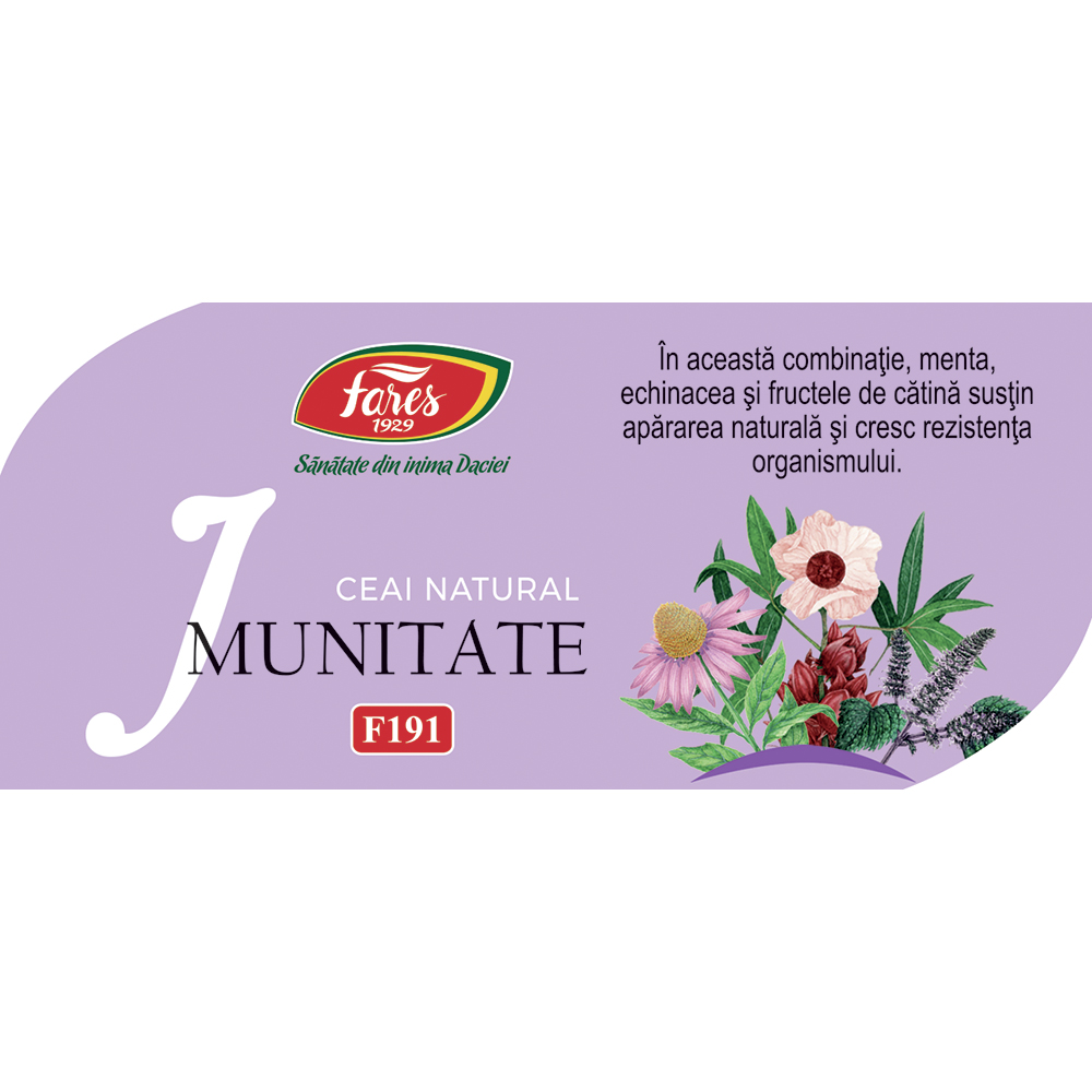 Ceai Fares Imunitate F191 – amestec de plante atent selecționate (hibiscus, busuioc, mentă, echinacea, cătină, măr și ulei esențial de grapefruit), pentru o infuzie plăcută și aromată, potrivită consumului zilnic.