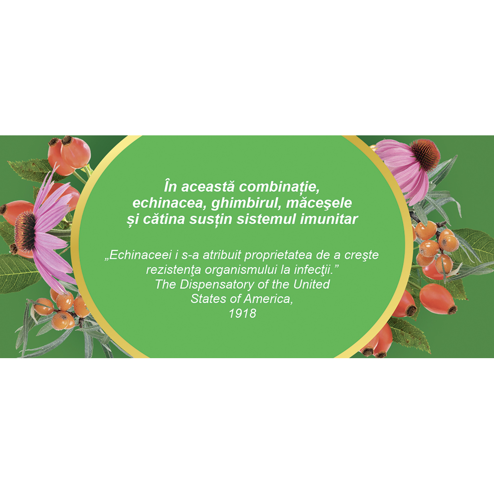 În această combinație, echinacea, ghimbirul, măceșele și cătina contribuie la susținerea sistemului imunitar.